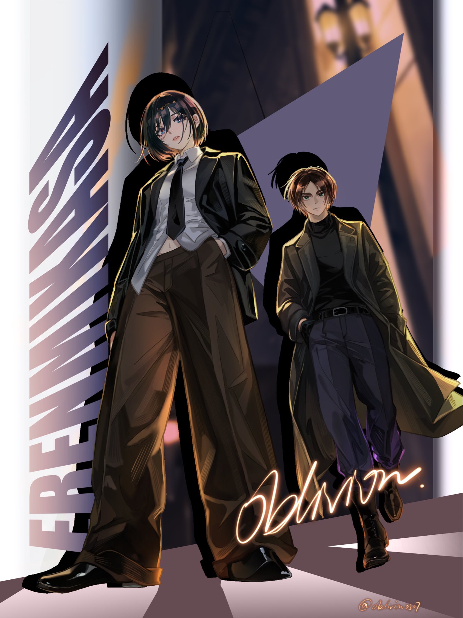 1boy 1girl artist_name black_boots black_coat black_hair black_jacket black_necktie black_pants black_shirt black_shoes boots breasts brown_hair brown_pants character_name closed_mouth coat collared_shirt eren_yeager from_below full_body green_eyes grey_eyes hair_between_eyes hand_in_pocket highres jacket long_coat medium_breasts midriff_peek mikasa_ackerman necktie pants parted_bangs parted_lips shingeki_no_kyojin shirt shoes short_hair standing suit_jacket turtleneck twitter_username walking white_shirt yabi_oblivion