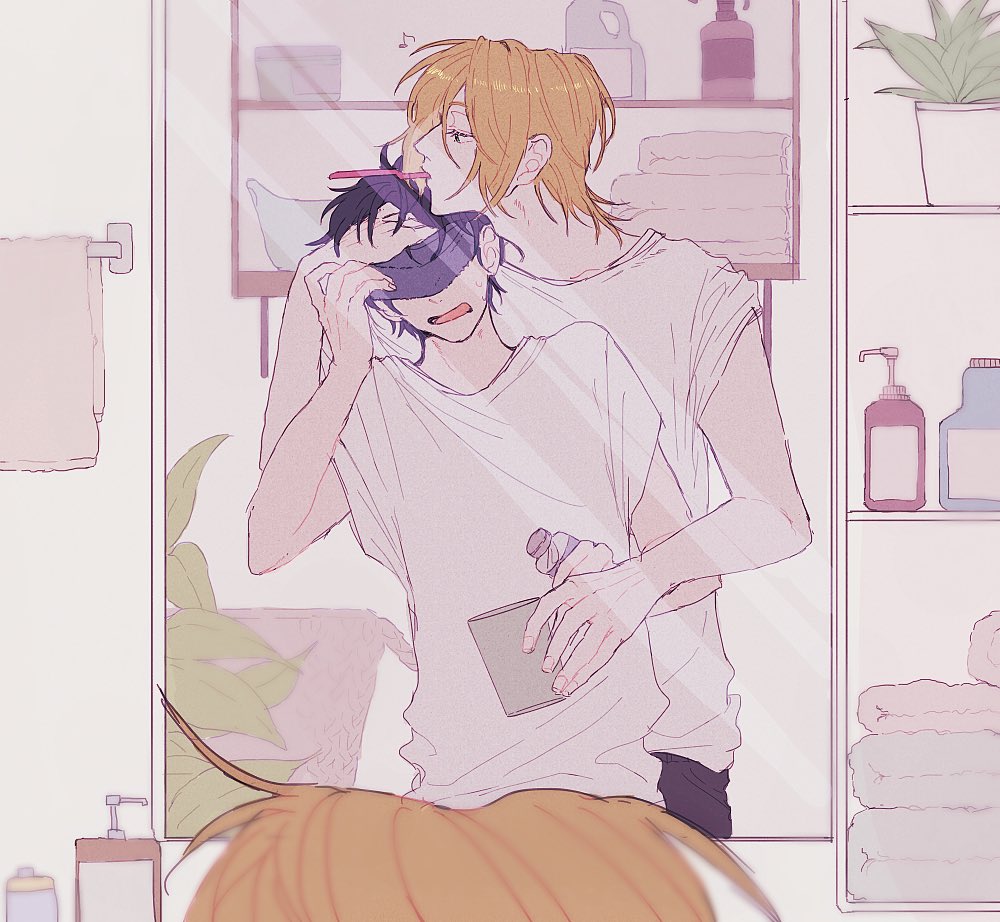 2boys a_co_pi ash_lynx banana_fish bathroom black_hair black_pants blonde_hair bottle commentary_request covered_eyes crew_neck cup hair_behind_ear hand_in_another's_hair holding holding_cup indoors male_focus mirror multiple_boys okumura_eiji pants plant potted_plant shirt short_sleeves soap_bottle toothbrush toothbrush_in_mouth towel white_shirt yaoi