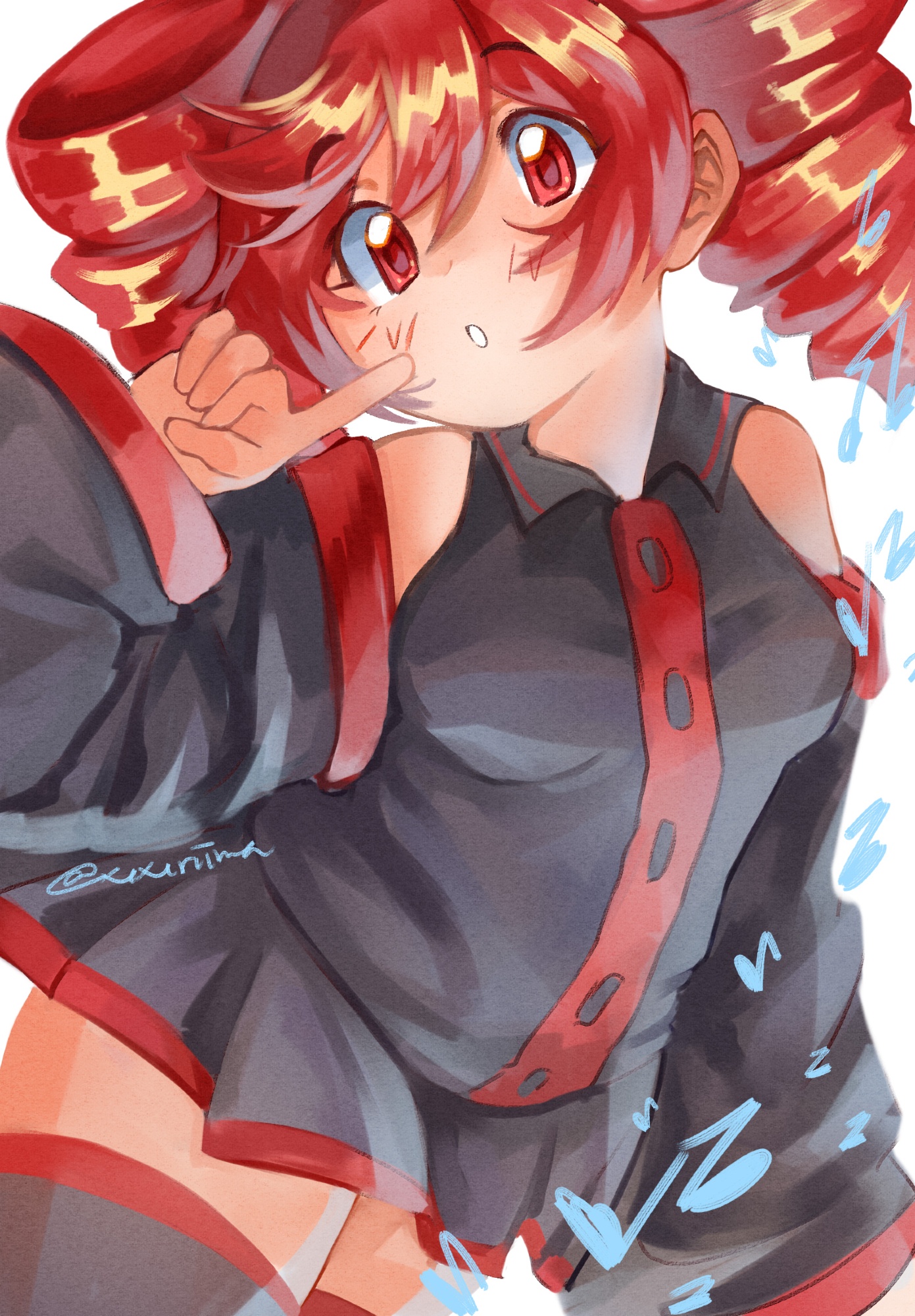 1girl :o arm_up black_shirt black_skirt black_thighhighs commentary detached_sleeves drill_hair english_commentary facial_mark head_tilt highres kasane_teto long_sleeves looking_at_viewer medium_hair musical_note open_mouth pinky_out pointing_at_cheek red_eyes red_hair red_trim shirt simple_background skirt solo swept_bangs teeth thighhighs twin_drills upper_body utau white_background wide_sleeves xixiriima zettai_ryouiki