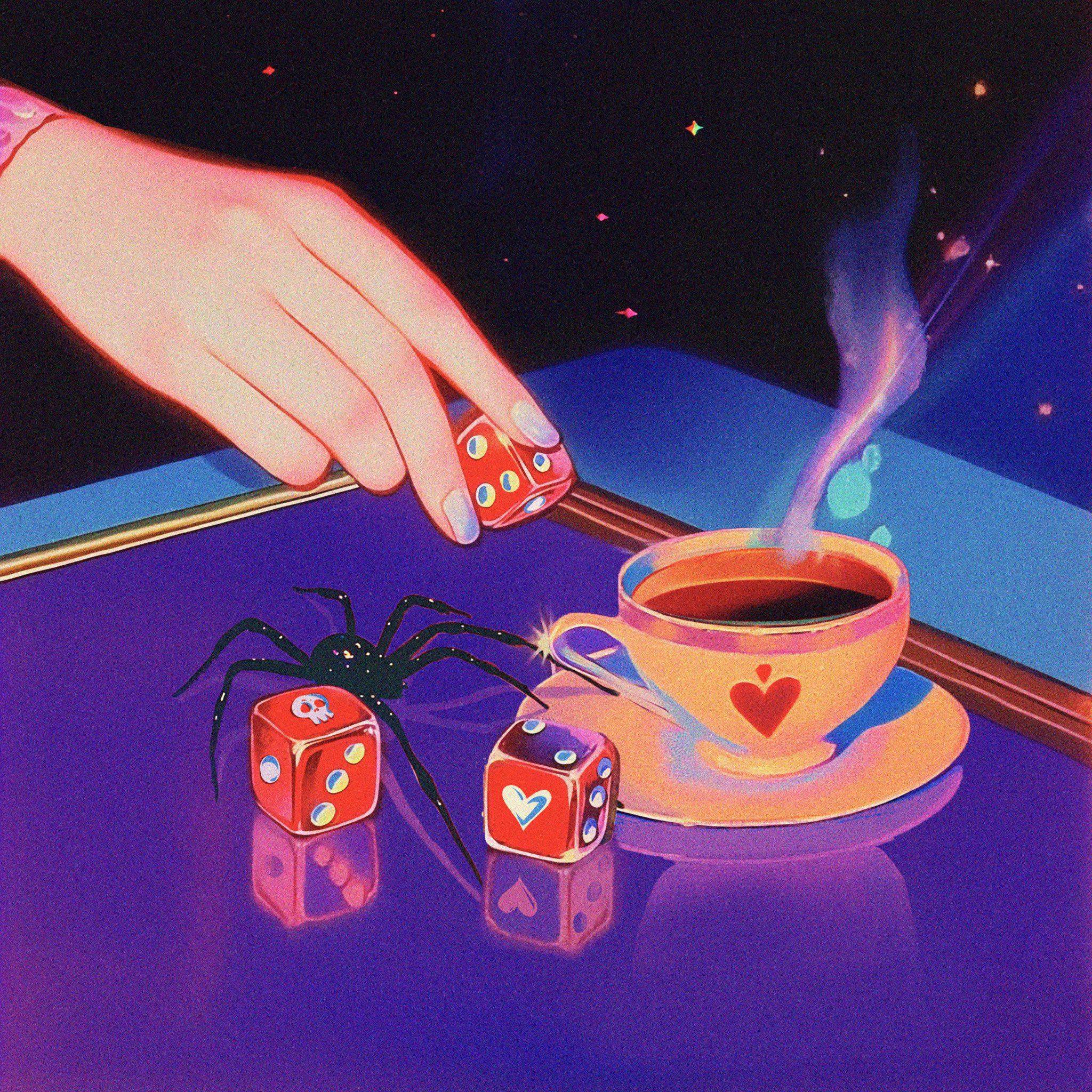 1other black_background blue_nails bug ceurelie coffee coffee_mug commentary cup dice english_commentary hand_focus heart highres holding holding_dice long_sleeves mug nail_polish original out_of_frame pink_sleeves plate reflection reflective_surface saucer skull_print solo sparkle spider steam