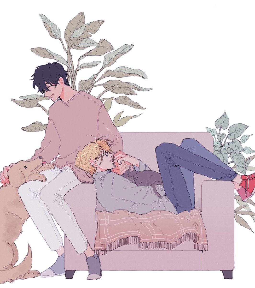 2boys a_co_pi ash_lynx banana_fish bespectacled black_cat black_hair blanket blonde_hair blue_pants brown_shirt cat closed_eyes commentary_request denim glasses grey_shirt hand_on_another's_head highres holding_hands jeans long_sleeves male_focus multiple_boys okumura_eiji pants plant red_shoes shirt shoes short_hair simple_background sitting sneakers white_background white_pants yaoi