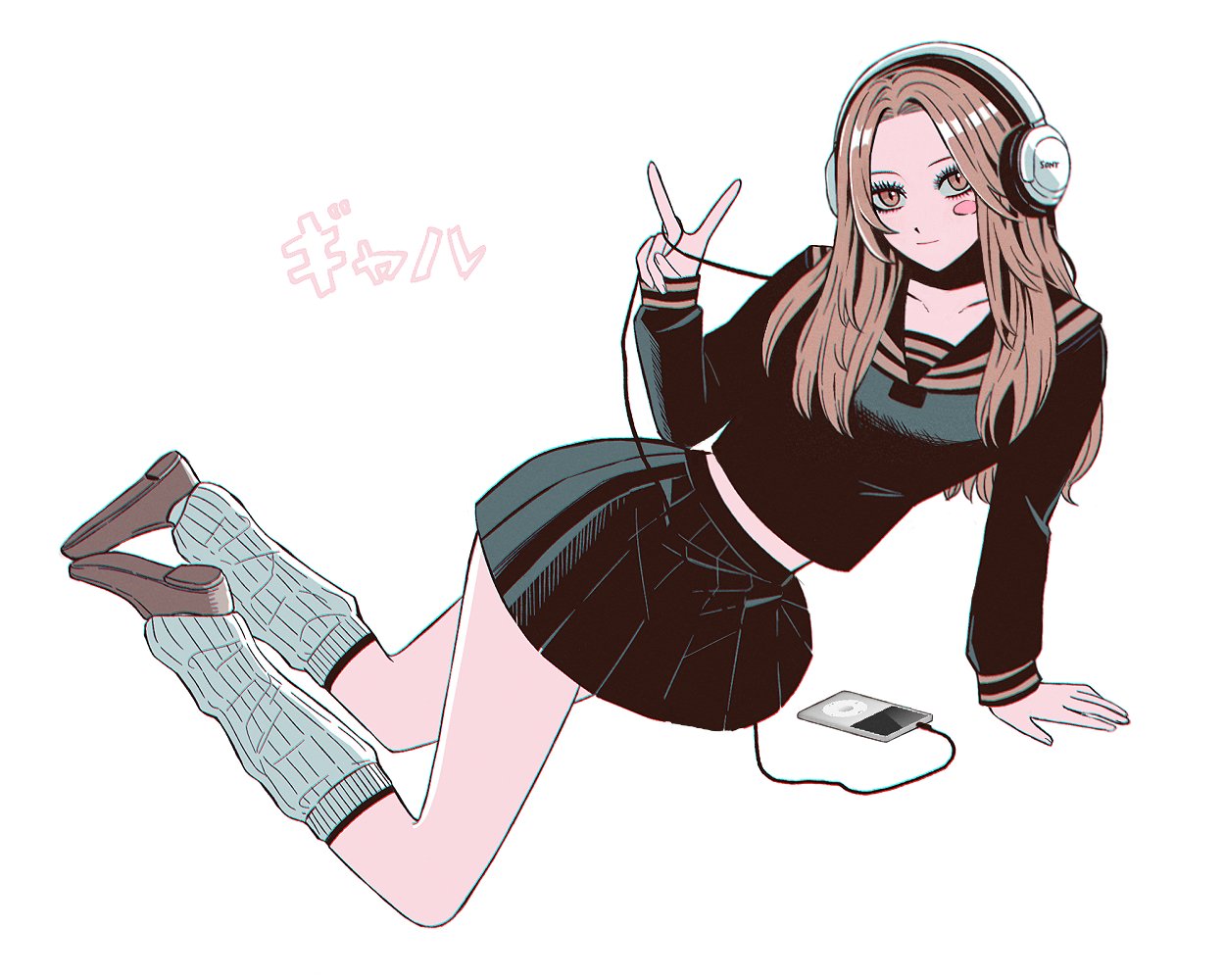 1girl black_serafuku black_skirt blush_stickers brown_shoes full_body headphones loafers long_hair long_sleeves looking_at_viewer loose_socks mp3_player ocolayapap orange_eyes orange_hair pleated_skirt school_uniform serafuku shiba_yuzuha shoes simple_background skirt smile socks solo tokyo_revengers v white_background white_socks