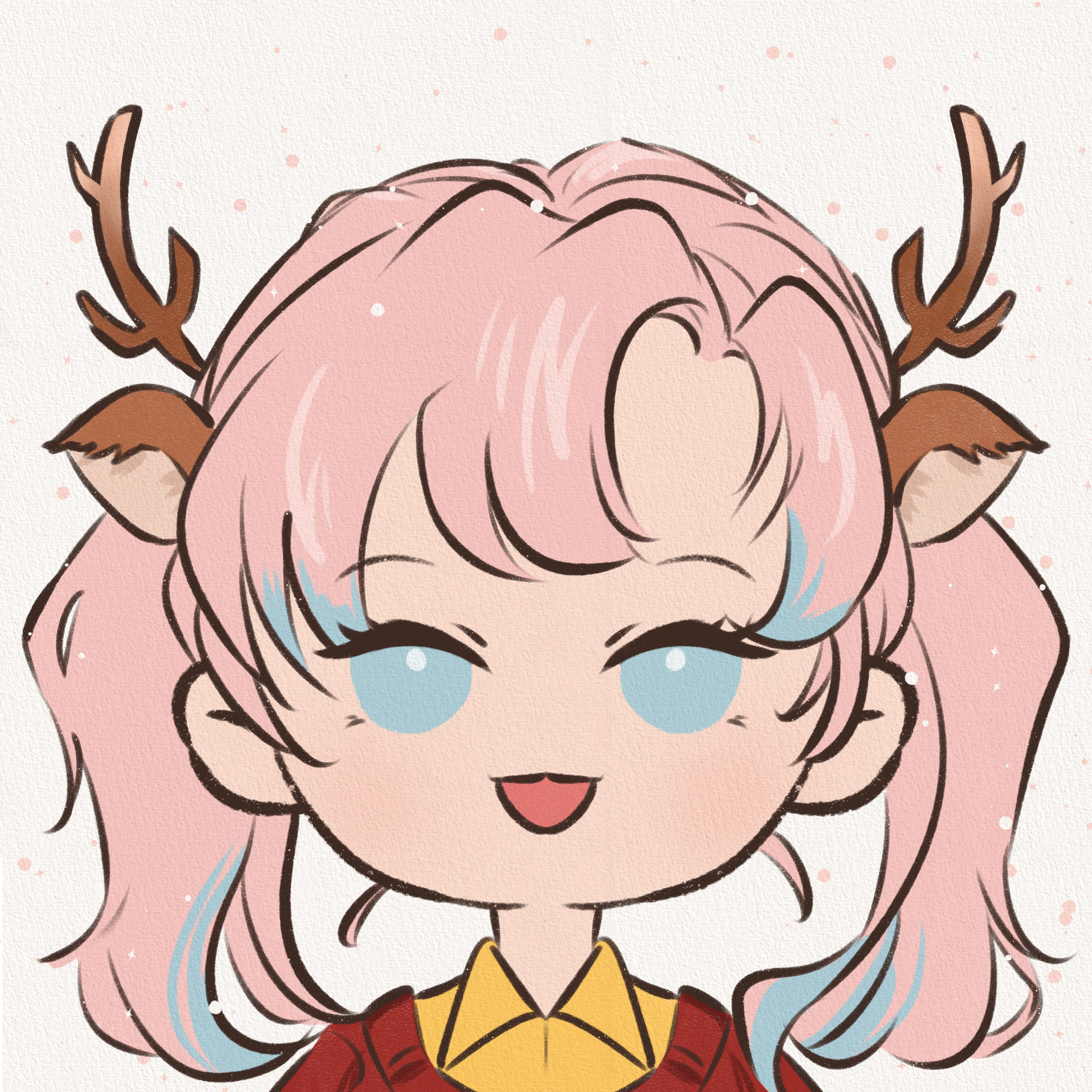 1girl anabellnordin animal_ears antlers blue_eyes blue_hair chibi collared_shirt commentary deer_antlers deer_ears highres horns long_hair looking_at_viewer multicolored_hair open_mouth original paper_texture pink_hair portrait red_sweater shirt solo streaked_hair sweater twintails two-tone_hair white_background yellow_shirt
