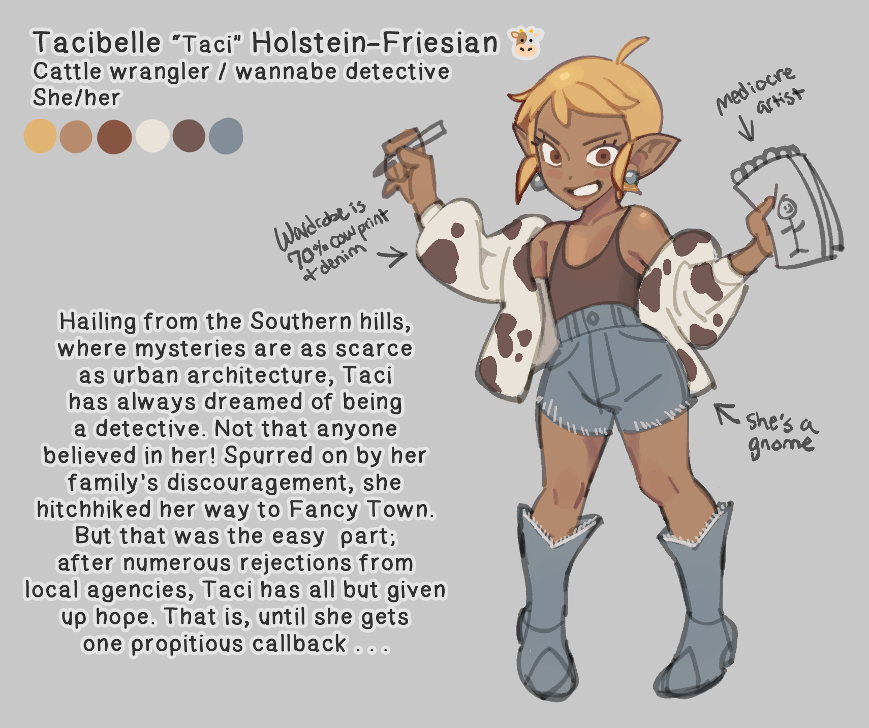 1girl ahoge blonde_hair boots denim denim_boots denim_shorts drawfee drawtectives earrings eyelashes full_body ganguro gnome grin gyaru highres jacket jewelry original petite pointy_ears procreate_(medium) shorts shy-shortcake single_earring smile solo standing tacibelle_holstein-friesian tank_top