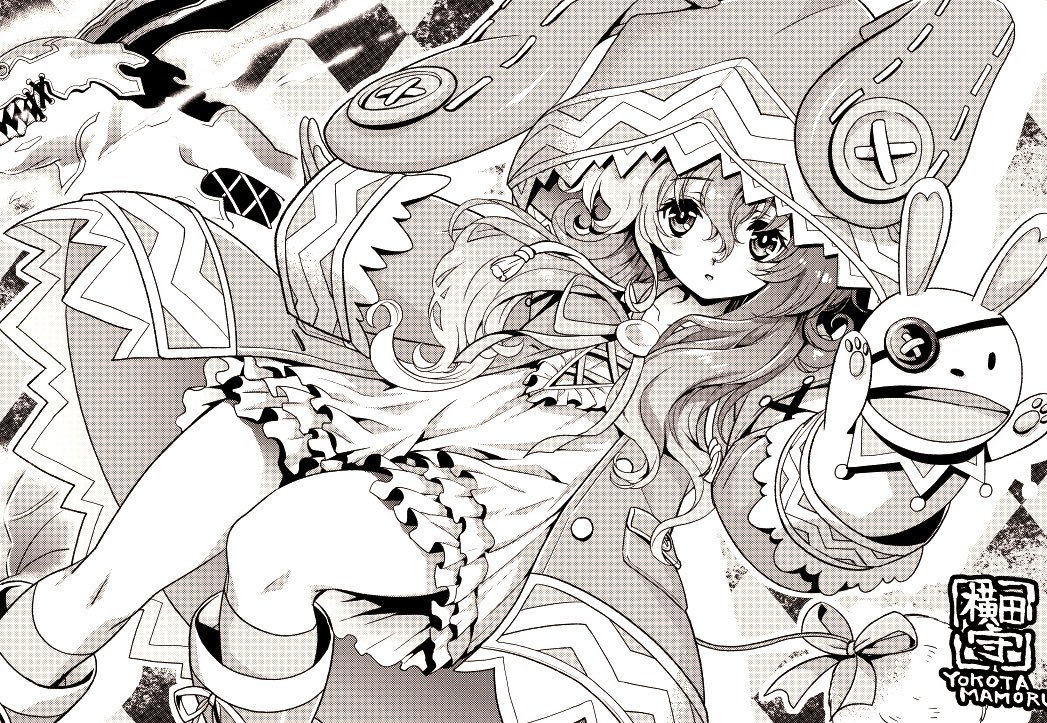 1girl animal_ear_hood animal_ears artist_name coat commentary_request date_a_live dress eyepatch fake_animal_ears fake_tail frilled_dress frills greyscale hand_puppet himekawa_yoshino himekawa_yoshino_(spirit) hood hood_up hooded_coat kneehighs layered_dress long_hair long_sleeves looking_at_viewer monochrome open_clothes open_coat parted_lips pom_pom_(clothes) puppet rabbit_ears rabbit_puppet ribbon sleeves_past_wrists socks solo tail yokota_mamoru yoshinon