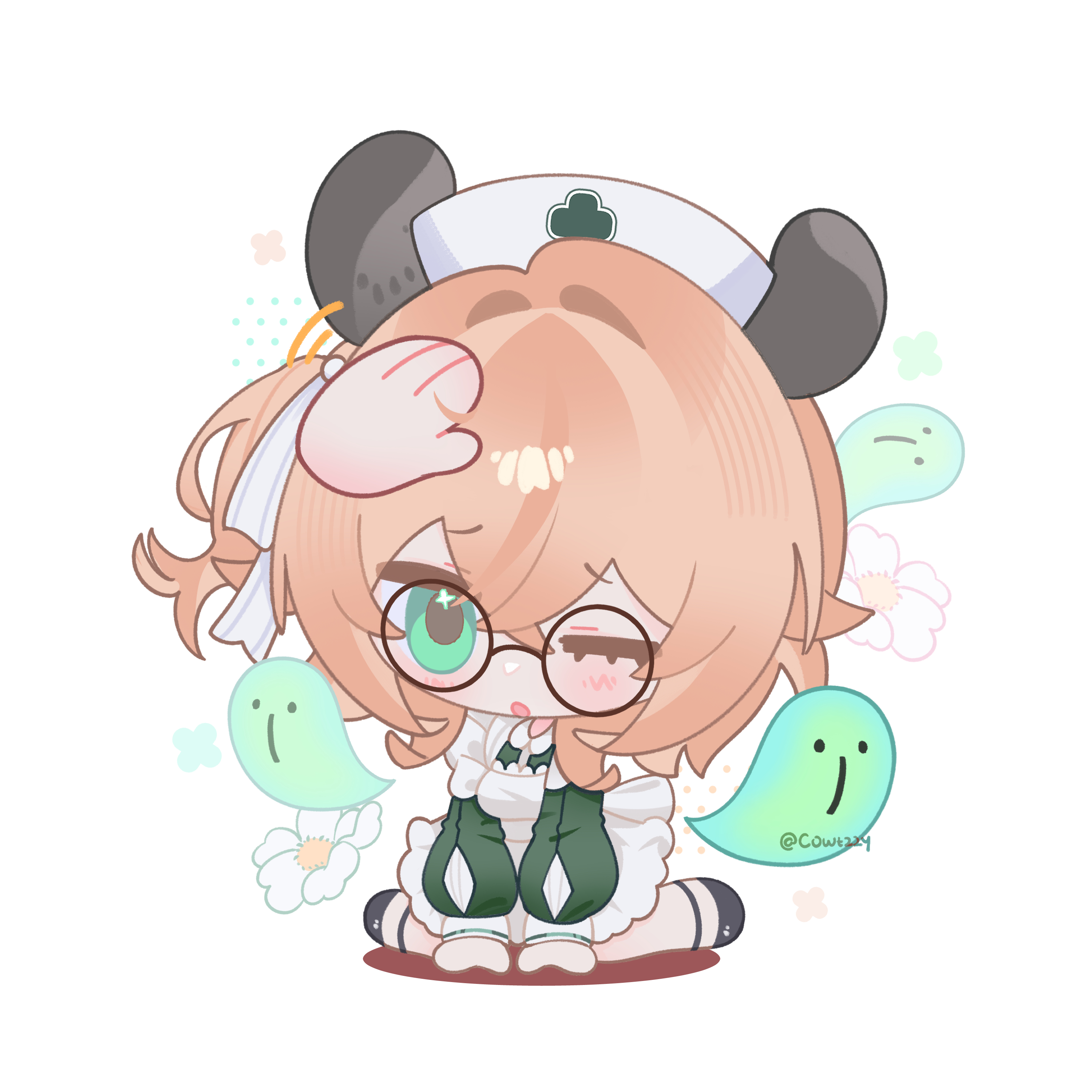 1girl absurdres animal_ears breasts brown_hair chibi commentary cowtzzy dress english_commentary full_body glasses green_dress green_eyes headpat highres indie_virtual_youtuber nimi_nightmare nimi_nightmare_(1st_costume) one_eye_closed round_eyewear simple_background solo_focus tapir_ears tapir_girl virtual_youtuber white_background