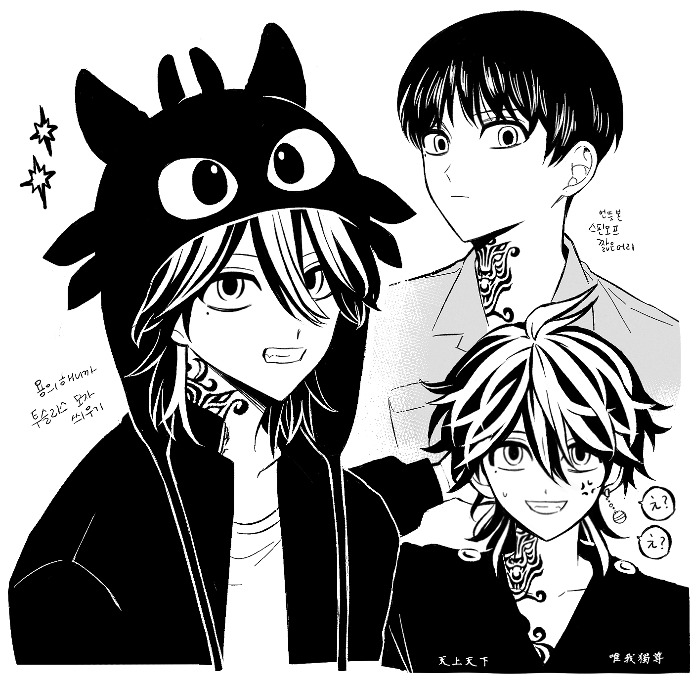 1boy anger_vein cosplay earrings greyscale grin hair_between_eyes hanemiya_kazutora highres hood hoodie how_to_train_your_dragon_(series) how_to_train_your_dragon_1 jewelry long_hair long_sleeves male_focus mole mole_under_eye monochrome multicolored_hair multiple_views neck_tattoo ocolayapap short_hair simple_background single_earring smile tattoo tiger_tattoo tokyo_revengers toothless toothless_(cosplay) two-tone_hair upper_body wolf_cut