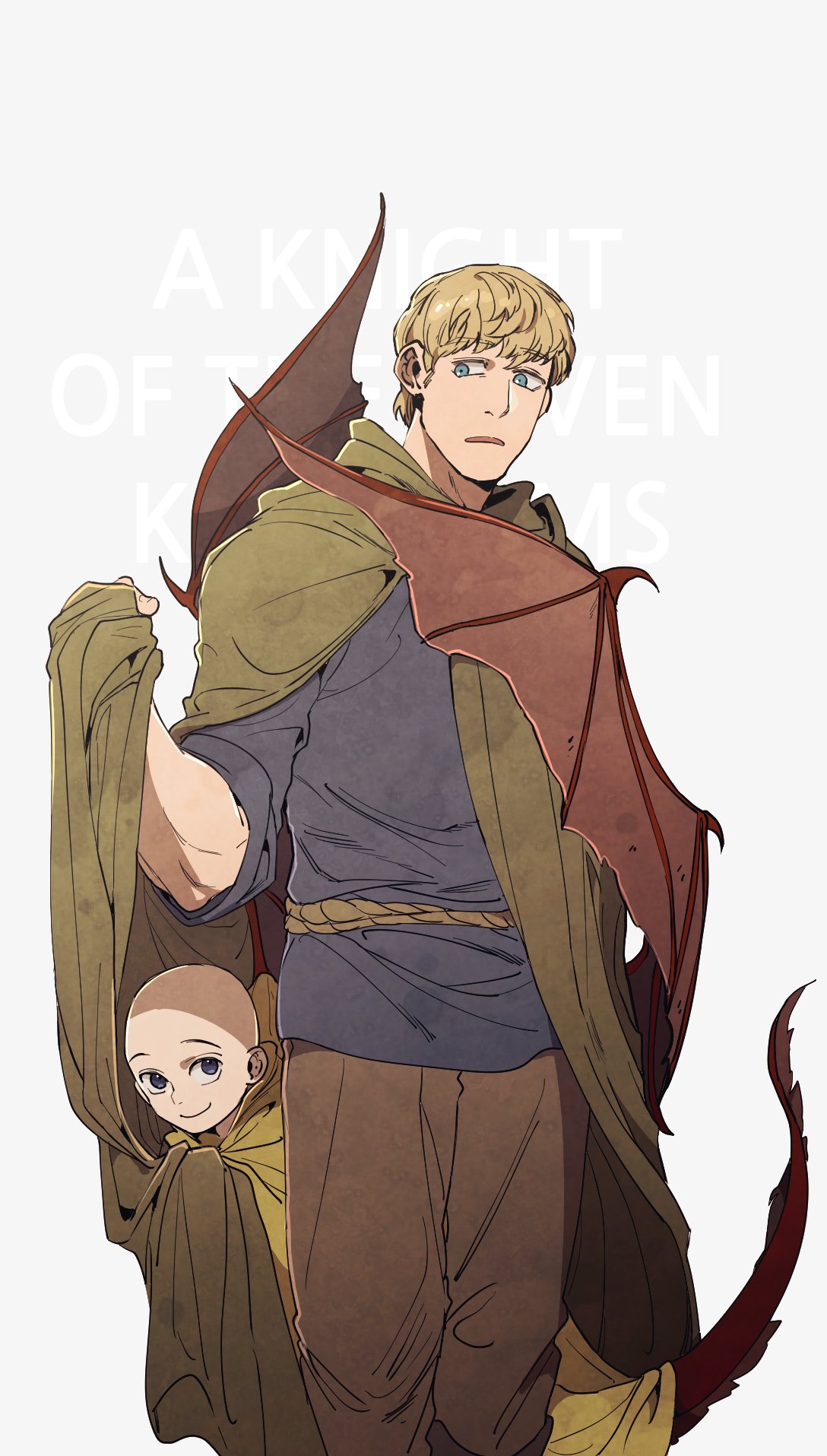2boys 6cheetah a_knight_of_the_seven_kingdoms a_song_of_ice_and_fire aegon_v_targaryen bald blonde_hair blue_eyes blue_shirt brown_pants child closed_mouth copyright_name cowboy_shot dragon_boy dragon_tail dragon_wings duncan_the_tall height_difference highres male_focus multiple_boys pants parted_lips purple_eyes rope_belt shirt short_hair sleeves_rolled_up smile tail wings yellow_cloak