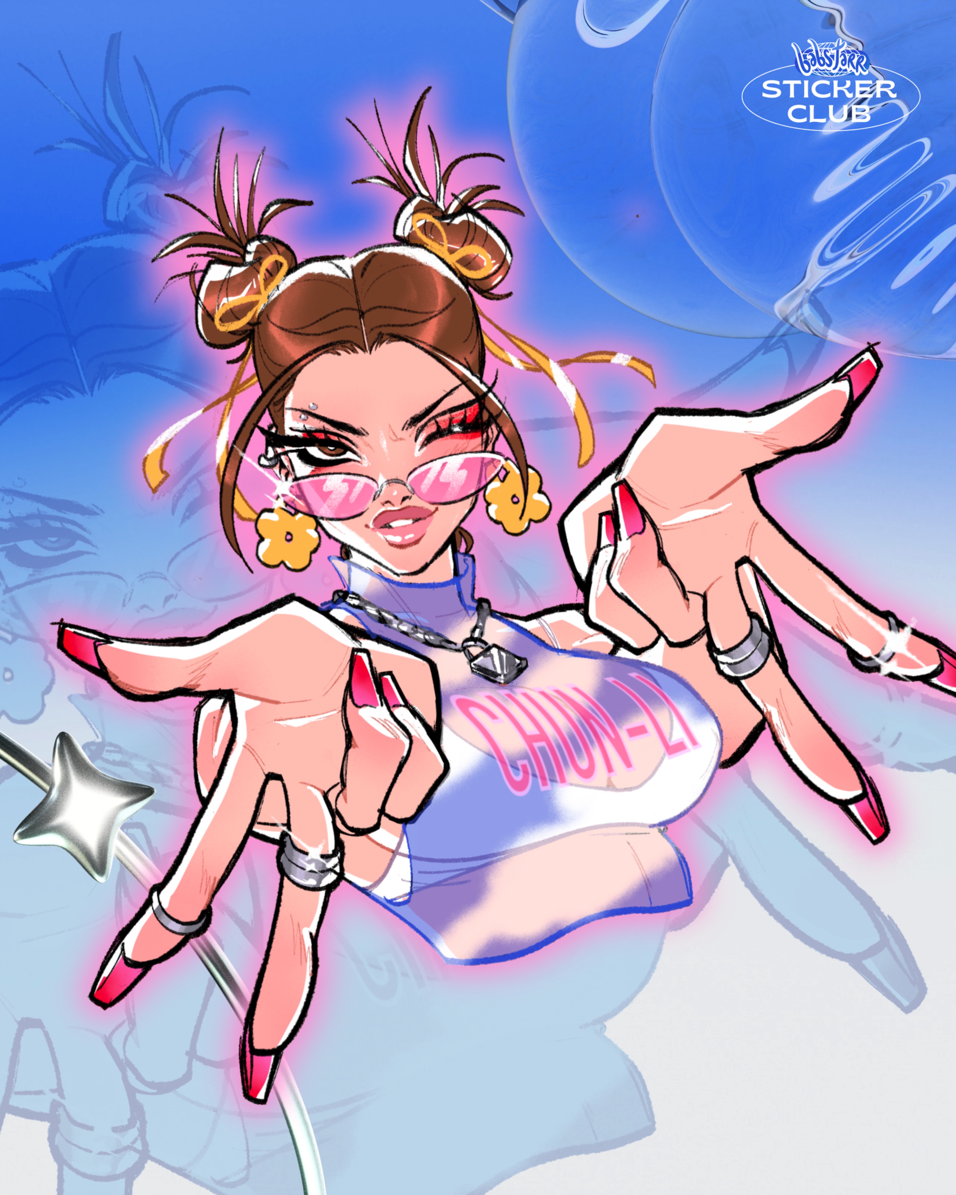 1girl absurdres babs_tarr bare_shoulders blue_background blue_shirt bra breasts brown_eyes brown_hair capcom chun-li crop_top cropped_torso double_bun double_gyaru_v earrings eyebrow_piercing eyeliner face_piercing fingernails flower_earrings gyaru_v hair_bun hair_ribbon highres jewelry lock long_fingernails looking_at_viewer makeup medium_breasts multiple_rings nail_polish necklace one_eye_closed outstretched_arms padlock parted_bangs parted_lips piercing pink-tinted_eyewear pink_lips pink_nails red_eyeliner ribbon ring see-through_clothes see-through_shirt shirt sleeveless sleeveless_turtleneck solo street_fighter sunglasses tinted_eyewear turtleneck underwear updo v white_bra yellow_ribbon
