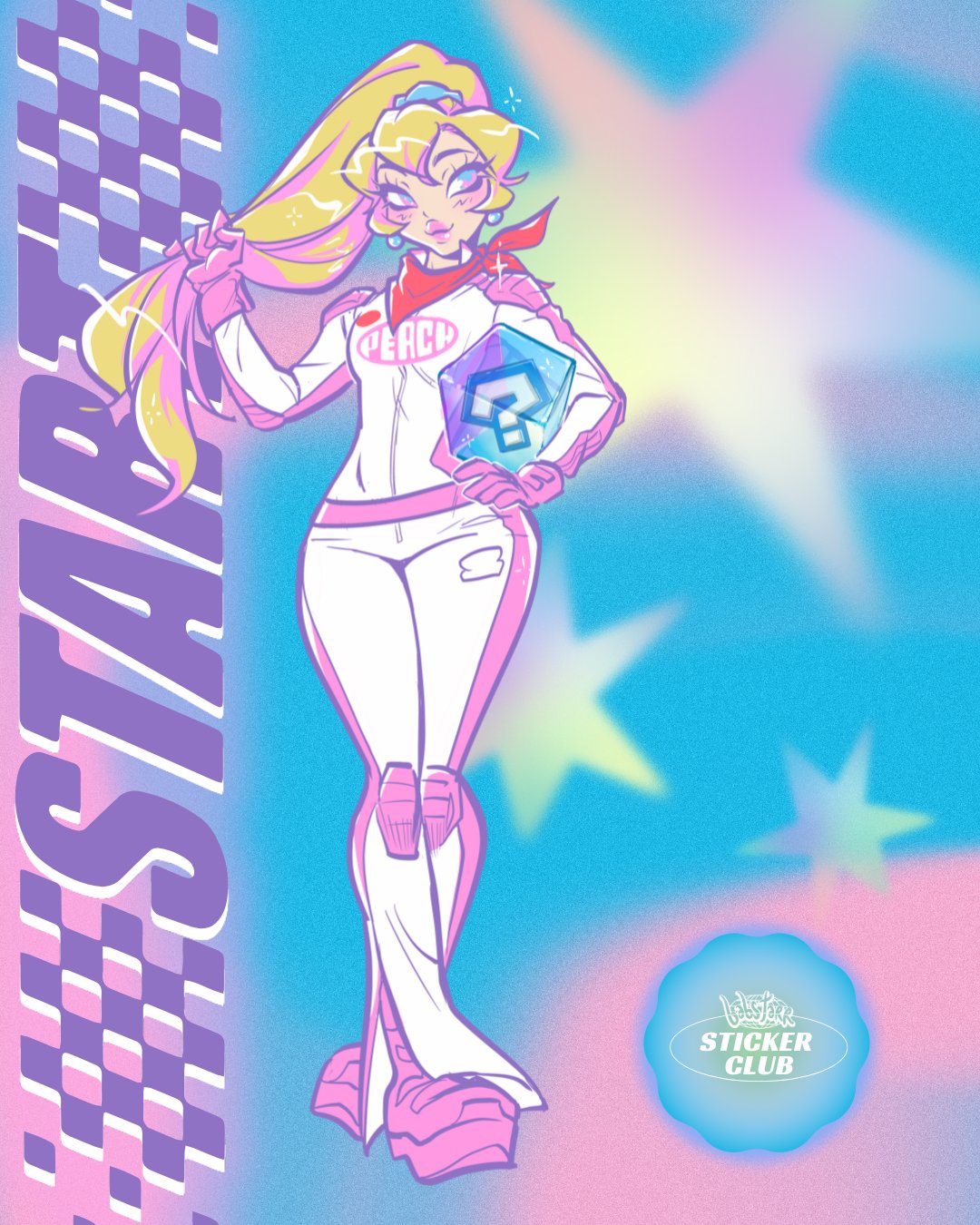 1girl babs_tarr biker_peach blonde_hair blue_eyes blurry blurry_background bodysuit boots breasts carrying carrying_under_arm character_name commentary earrings english_commentary full_body gloves hand_in_own_hair hand_on_own_hip highres holding_cube jewelry knee_pads long_hair mario_(series) mario_kart mario_kart_world medium_breasts neckerchief nintendo pink_boots pink_gloves pink_lips pink_neckerchief ponytail princess_peach solo standing white_bodysuit