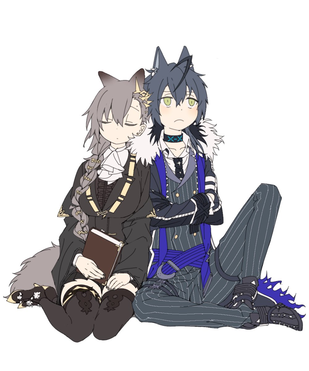 1boy 1girl animal_ears arknights ascot black_coat black_shoes blush braid brown_hair brown_thighhighs cape closed_eyes coat commentary crossed_arms embarrassed formal_clothes frown full_body fur-trimmed_cape fur_trim green_eyes grey_suit highres infection_monitor_(arknights) knee_up long_hair looking_to_the_side penance_(arknights) pinstripe_pattern pinstripe_suit shoes simple_background sleeping sleeping_on_person suit tail thighhighs vigil_(arknights) white_ascot white_background wolf_boy wolf_ears wolf_girl wolf_tail wqn0930