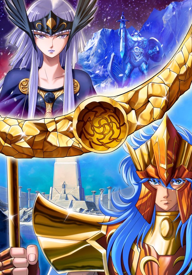 1boy 1girl armor blue_eyes blue_hair boobplate breastplate cloak closed_mouth column commentary_request day gauntlets glint gold_armor hair_over_shoulder headpiece helmet holding holding_staff julian_solo lipstick long_hair long_sidelocks looking_at_viewer makeup outdoors pillar polaris_hilda poseidon_(saint_seiya) purple_cloak purple_eyes purple_hair purple_lips saint_seiya shoulder_armor sidelocks staff star_(sky) statue winged_helmet yokota_mamoru