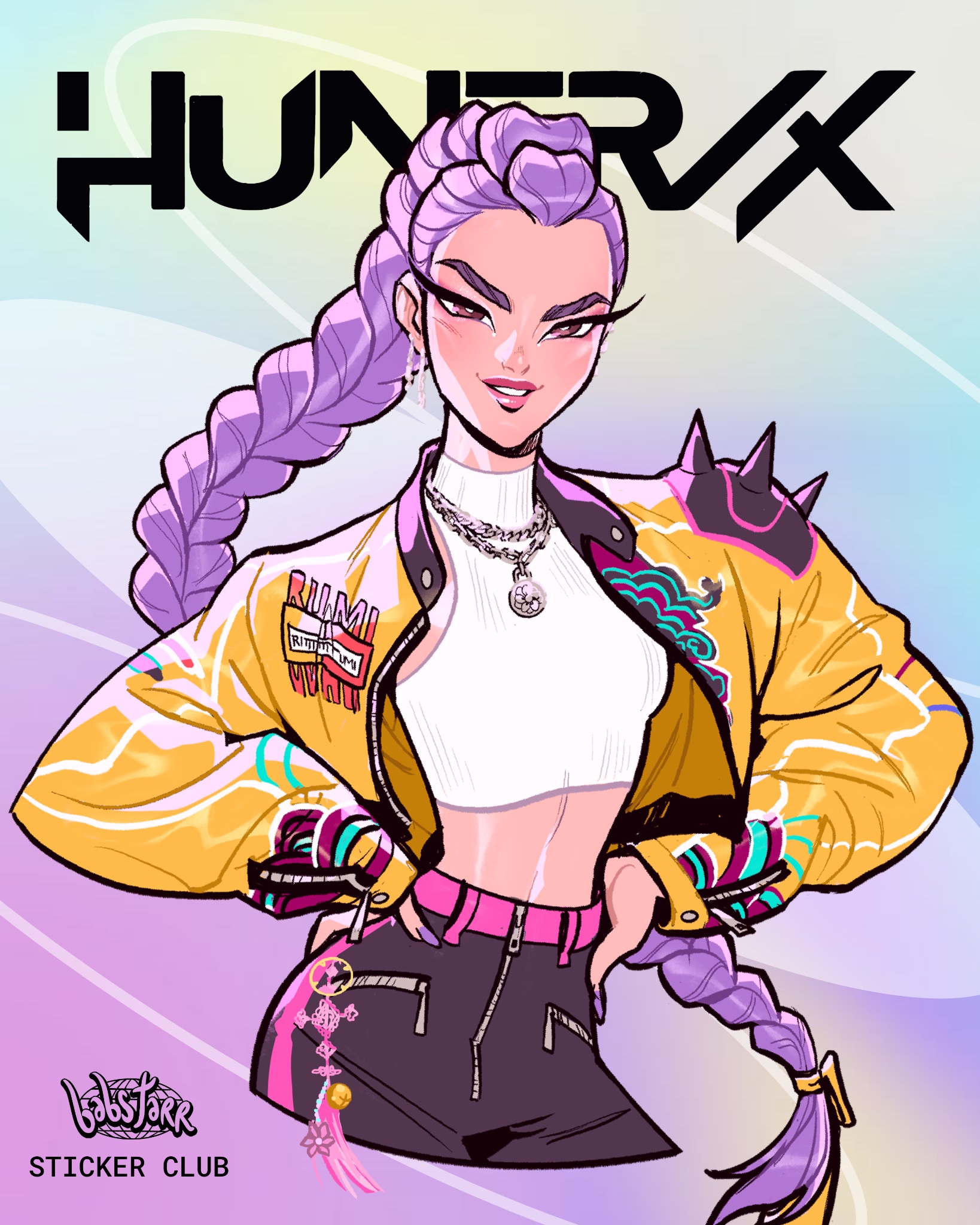 1girl artist_name babs_tarr black_shorts braid breasts brown_eyes commentary cowboy_shot crop_top earrings english_commentary group_name hands_on_own_hips highres jacket jewelry kpop_demon_hunters long_hair looking_at_viewer medium_breasts nail_polish necklace parted_lips pink_lips purple_hair purple_nails ribbed_shirt rumi_(kpop_demon_hunters) shirt shorts shoulder_spikes silver_necklace single_braid sleeveless sleeveless_turtleneck smile solo spikes turtleneck upper_body white_shirt yellow_jacket
