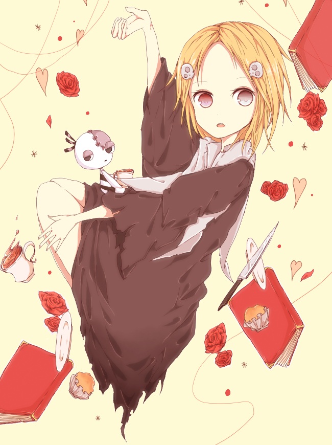 1girl blonde_hair blue_eyes book child cupcake flower food hair_ornament knife lenore lenore_lynchfast lenore_the_cute_little_dead_girl plate ragamuffin red_eyes skull
