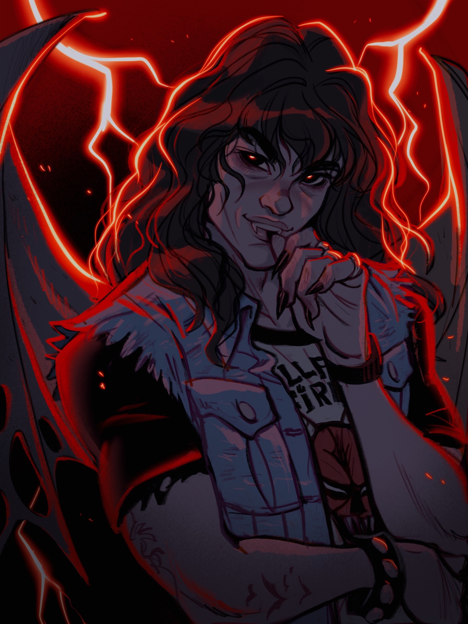 1boy arm_tattoo babs_tarr black_eyes black_nails black_shirt bracelet brown_hair commentary crossed_arms demon_wings denim denim_jacket eddie_munson fangs fingernails highres jacket jewelry lightning long_hair male_focus nail_polish parted_lips print_shirt red_pupils sharp_fingernails shirt solo stranger_things studded_bracelet tattoo torn_clothes torn_sleeves untranslatable_commentary wavy_hair wings