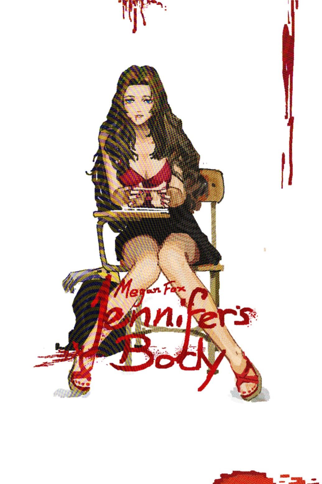 1girl backpack bag black_skirt blood blood_on_mouth blue_eyes brown_hair chair english_text highres horror_(theme) jennifer's_body limbus_company long_hair looking_at_viewer movie_poster_(medium) on_chair parody project_moon ravenlynch886 red_nails red_sandals red_shirt rodion_(project_moon) sandals school_chair severed_arm severed_limb shirt simple_background sitting skirt solo white_background