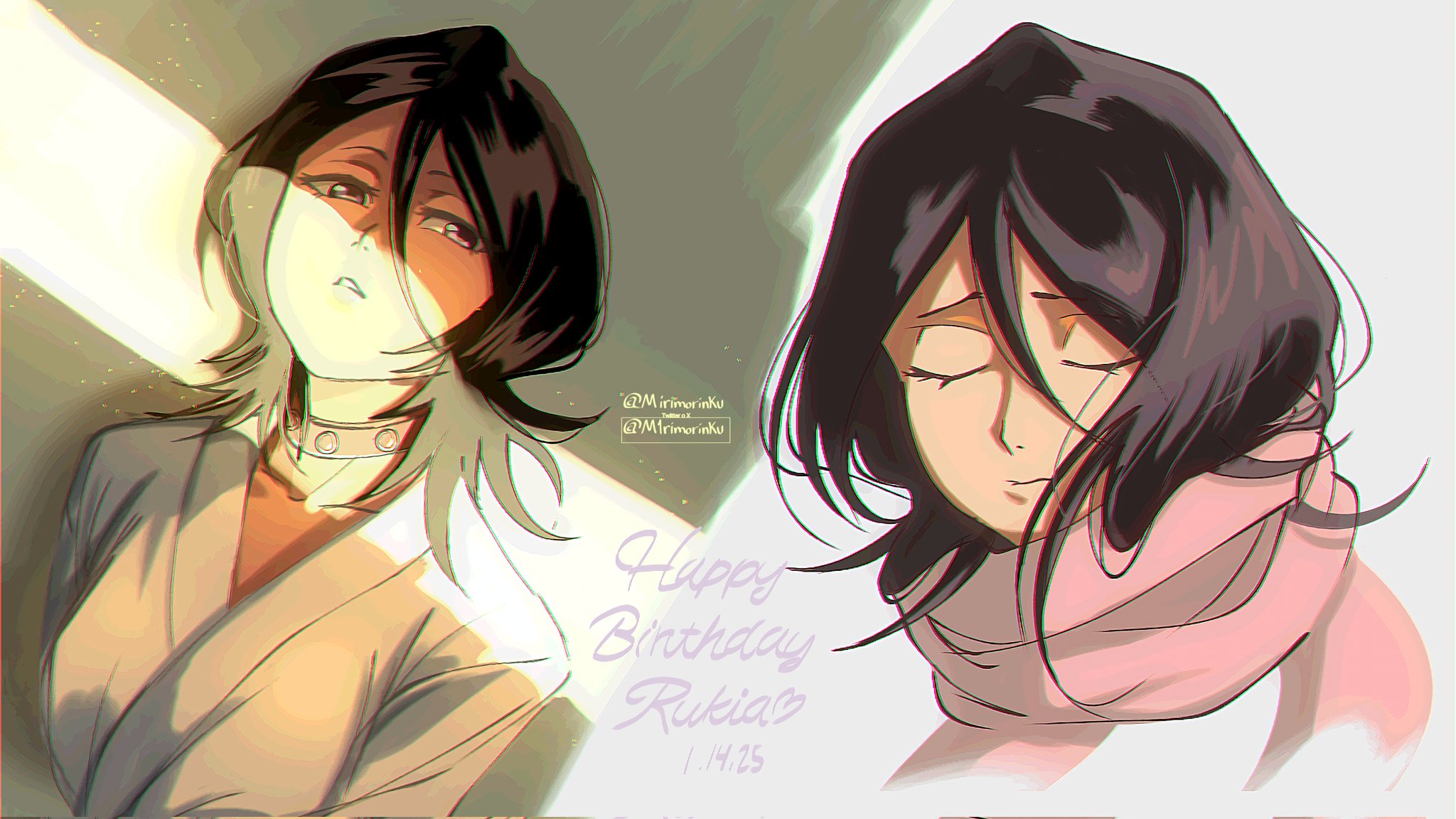 1girl 2025 black_hair bleach breasts character_name choker closed_eyes dated hair_between_eyes half-closed_eyes happy_birthday highres kuchiki_rukia looking_at_viewer m1rimorinku medium_breasts medium_hair multiple_views parted_lips pink_scarf purple_eyes scarf shirt solo twitter_username upper_body white_shirt