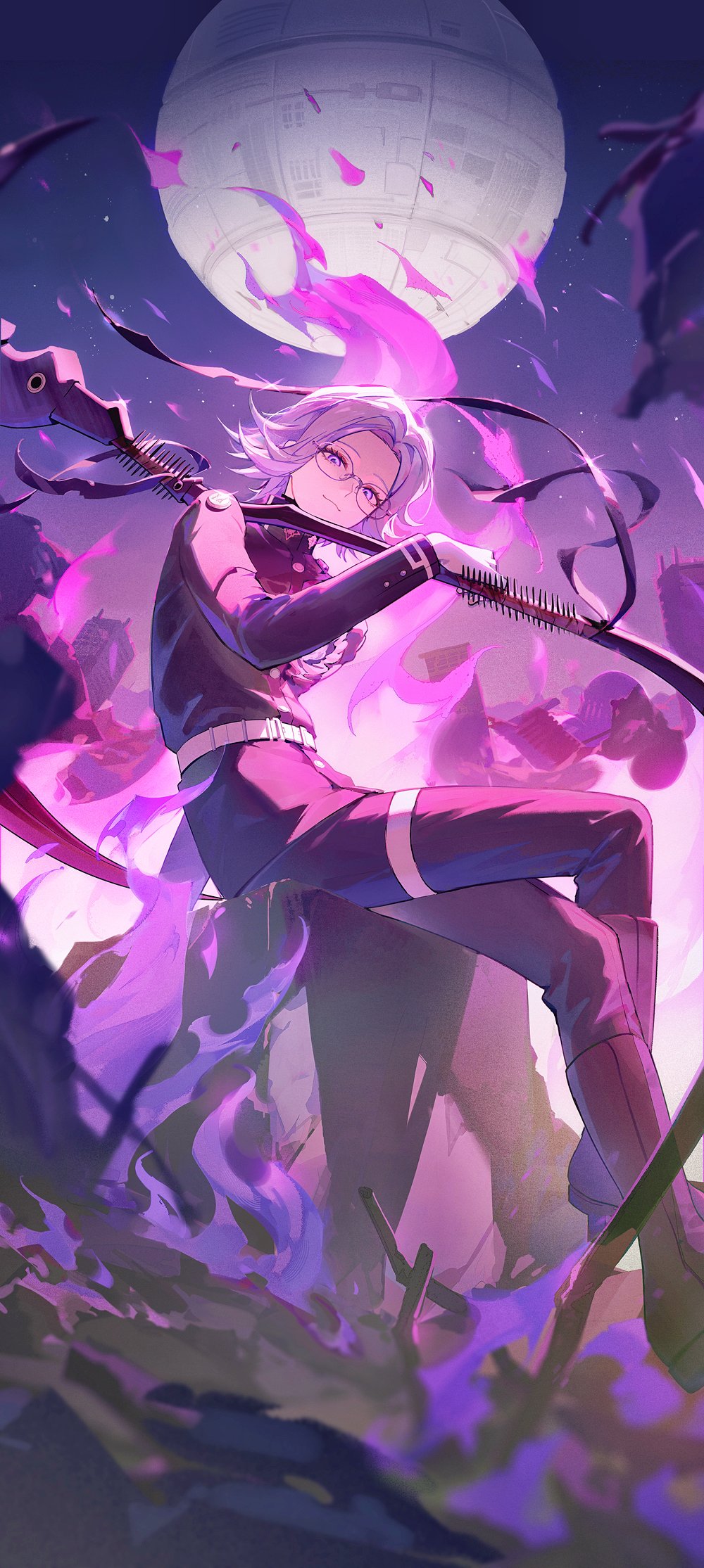 1boy aotsuki_eito arm_up belt black_boots black_jacket black_pants blue_eyes boots closed_mouth collared_jacket commentary_request crossed_legs eyelashes fire full_body glasses highres holding holding_scythe holding_weapon jacket last_defense_academy_school_uniform long_sleeves looking_at_viewer male_focus over_shoulder pants parted_hair purple_fire rimless_eyewear school_uniform scythe shiosakana sky solo spacecraft star_(sky) starry_sky the_hundred_line_-last_defense_academy- thigh_belt thigh_strap weapon weapon_over_shoulder white_belt