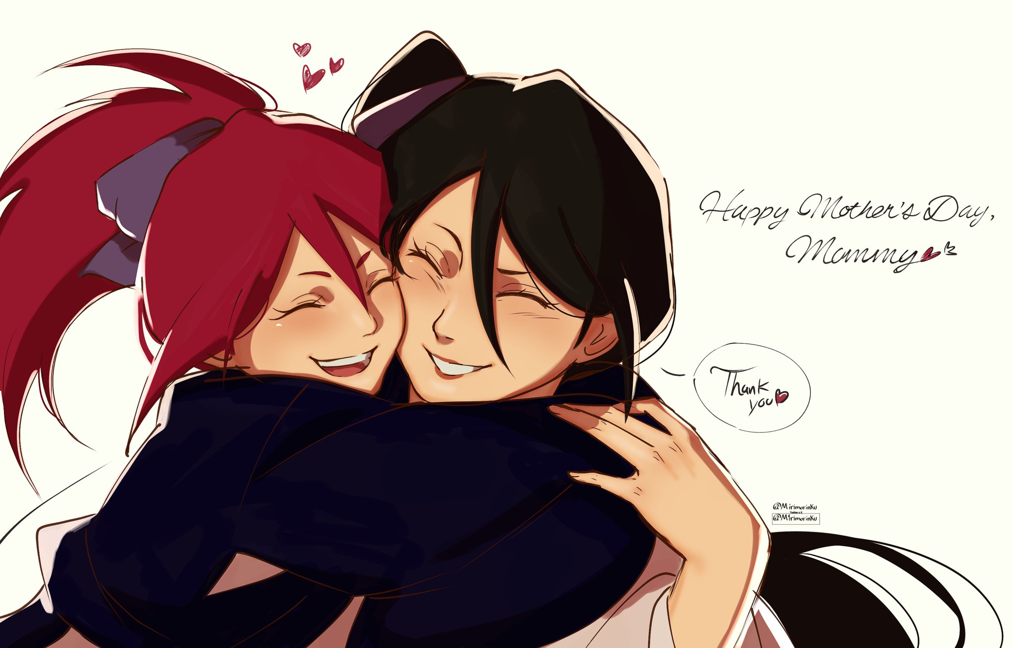 2girls abarai_ichika arms_around_neck black_hair bleach bleach:_epilogue child closed_eyes english_text hair_between_eyes happy_mother's_day highres hug japanese_clothes kuchiki_rukia light_blush long_hair m1rimorinku mother_and_child mother_and_daughter multiple_girls open_mouth parent_and_child parted_lips ponytail red_hair side_ponytail smile thank_you upper_body white_background