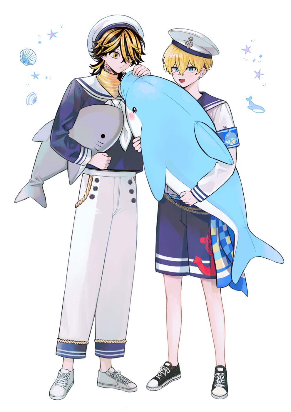 2boys black_hair blonde_hair blue_eyes blue_sailor_collar blue_shirt commentary earrings full_body hair_between_eyes hanemiya_kazutora hat highres holding holding_stuffed_toy jewelry long_sleeves male_focus matsuno_chifuyu mole mole_under_eye multicolored_hair multiple_boys neck_tattoo ocolayapap open_mouth pants sailor_collar shirt short_hair simple_background single_earring smile standing stuffed_animal stuffed_dolphin stuffed_shark stuffed_toy tattoo tokyo_revengers tokyo_revengers_pazuribe! two-tone_hair untranslatable_commentary white_hat white_pants white_sailor_collar white_shirt wolf_cut yellow_eyes