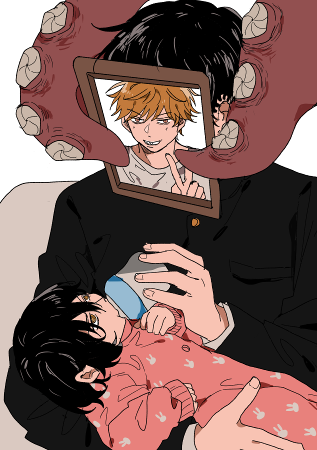 1boy 1girl baby baby_bottle baby_carry black_hair bottle carrying chainsaw_man denji_(chainsaw_man) ear_piercing feeding fingernails gakuran multiple_piercings nayuta_(chainsaw_man) piercing portrait_(object) ringed_eyes school_uniform short_hair sitting v yoshida_hirofumi yui_(yuina14)