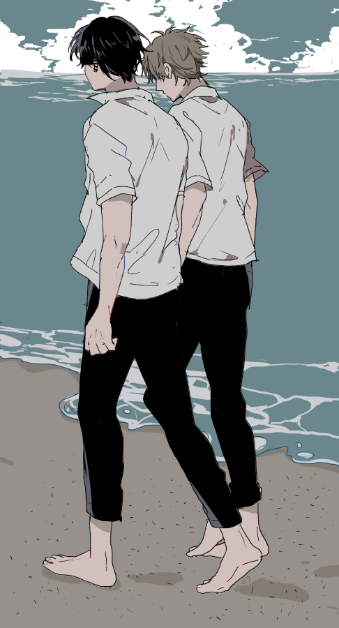 2boys barefoot beach black_hair black_pants chainsaw_man denji_(chainsaw_man) ear_piercing full_body male_focus multiple_boys multiple_piercings ocean pants piercing sand short_hair short_sleeves sky standing walking yoshida_hirofumi yui_(yuina14)