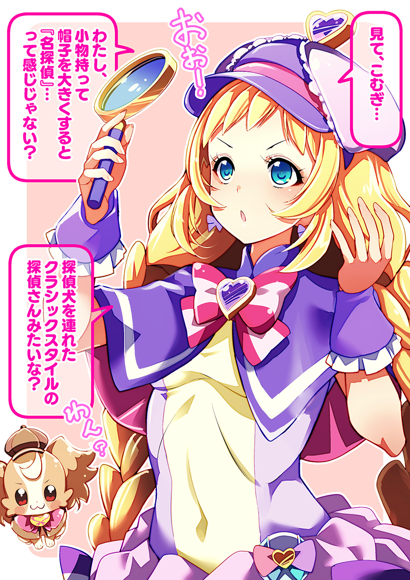 1girl alternate_headwear blonde_hair blue_eyes bow bow_earrings bowtie braid brooch capelet commentary_request cure_friendy dog dress earrings flat_cap frilled_cuffs hamuhamu hat hat_ornament heart heart_brooch heart_hat_ornament holding holding_magnifying_glass inukai_iroha inukai_komugi inukai_komugi_(dog) jewelry long_hair magical_girl magnifying_glass pact_holder partial_commentary pink_bow pink_bowtie precure purple_capelet purple_dress purple_hat solo standing translated twin_braids very_long_hair wonderful_precure!