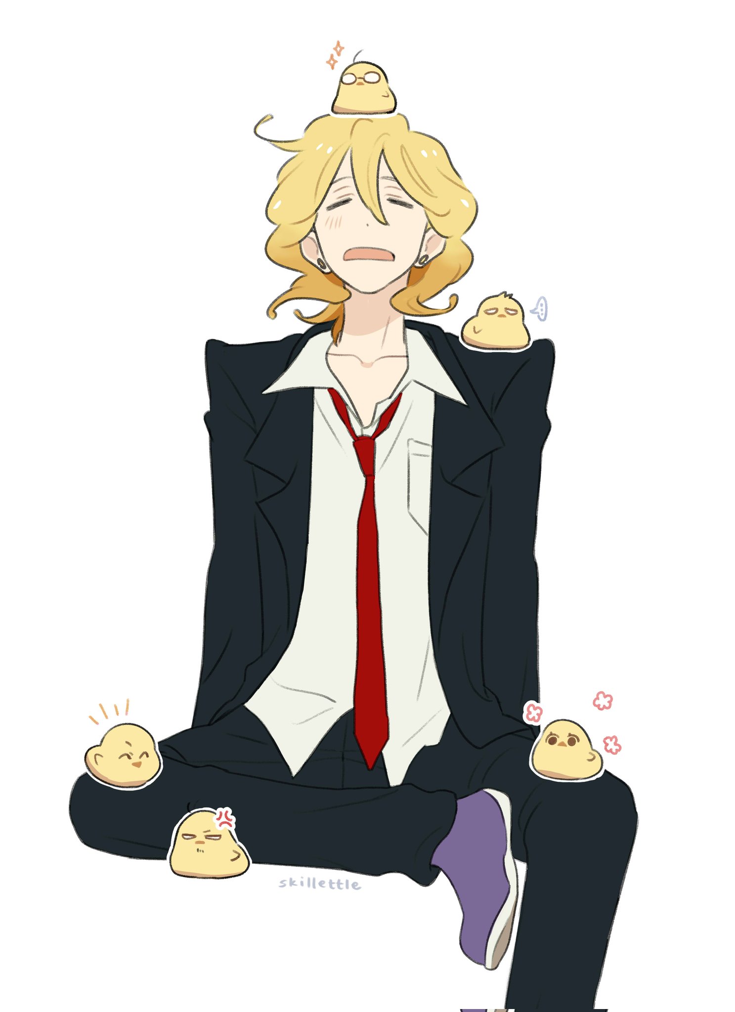 1boy animal artist_name baby_animal bird black_jacket black_pants blonde_hair butter_skittles chick closed_eyes collared_shirt commentary corrupted_twitter_file doukyuusei_(manga) earrings highres jacket jewelry kusakabe_hikaru male_focus necktie open_mouth pants red_necktie shirt short_hair simple_background sitting solo untranslatable_commentary white_background white_shirt