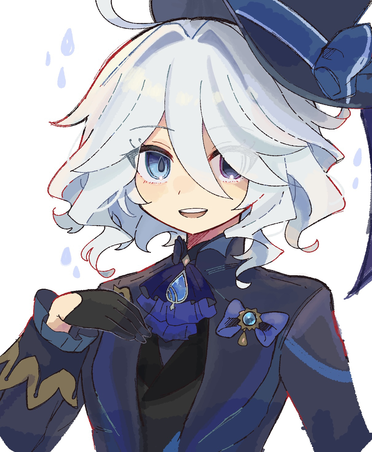 1girl ahoge ascot black_gloves black_vest blue_ascot blue_eyes blue_hair blue_hat blue_jacket blue_ribbon brooch commentary_request eyelashes furina_(genshin_impact) genshin_impact gloves hara_(nanohara) hat hat_ribbon heterochromia highres jacket jewelry looking_at_viewer open_mouth ribbon short_hair simple_background smile solo teeth top_hat upper_body upper_teeth_only vest white_background