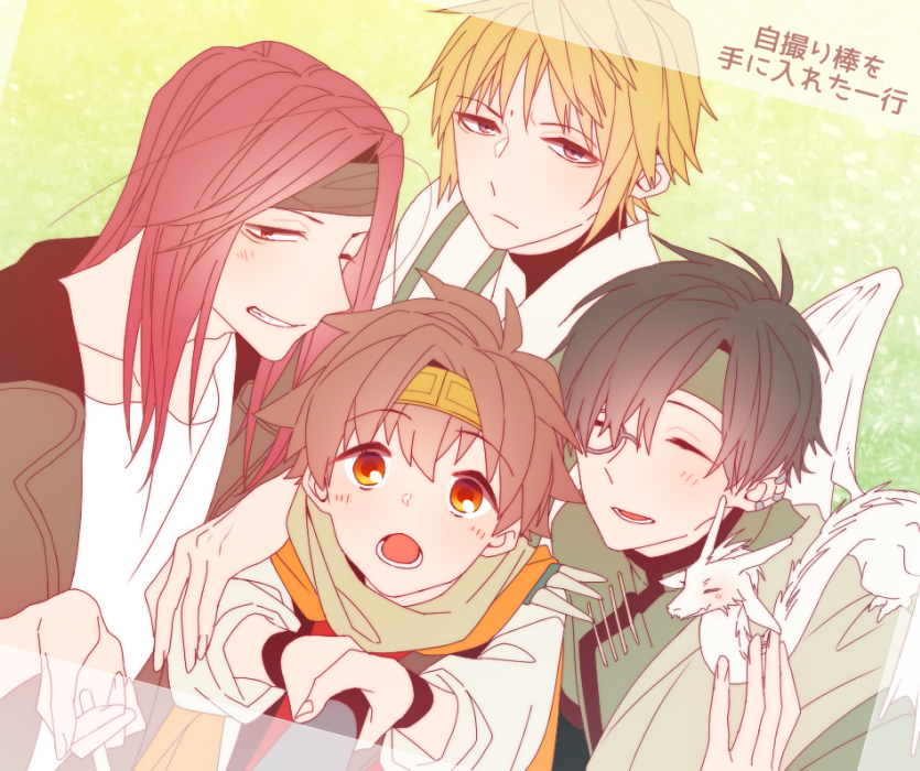 4boys black_hair blonde_hair brown_hair cho_hakkai circlet dragon from_above genjou_sanzou headband hiroki_(redcco) jacket jeep_(saiyuki) male_focus multiple_boys open_mouth red_hair saiyuki scarf selfie selfie_stick sha_gojyo shirt short_hair smile son_goku_(saiyuki) teeth wristband