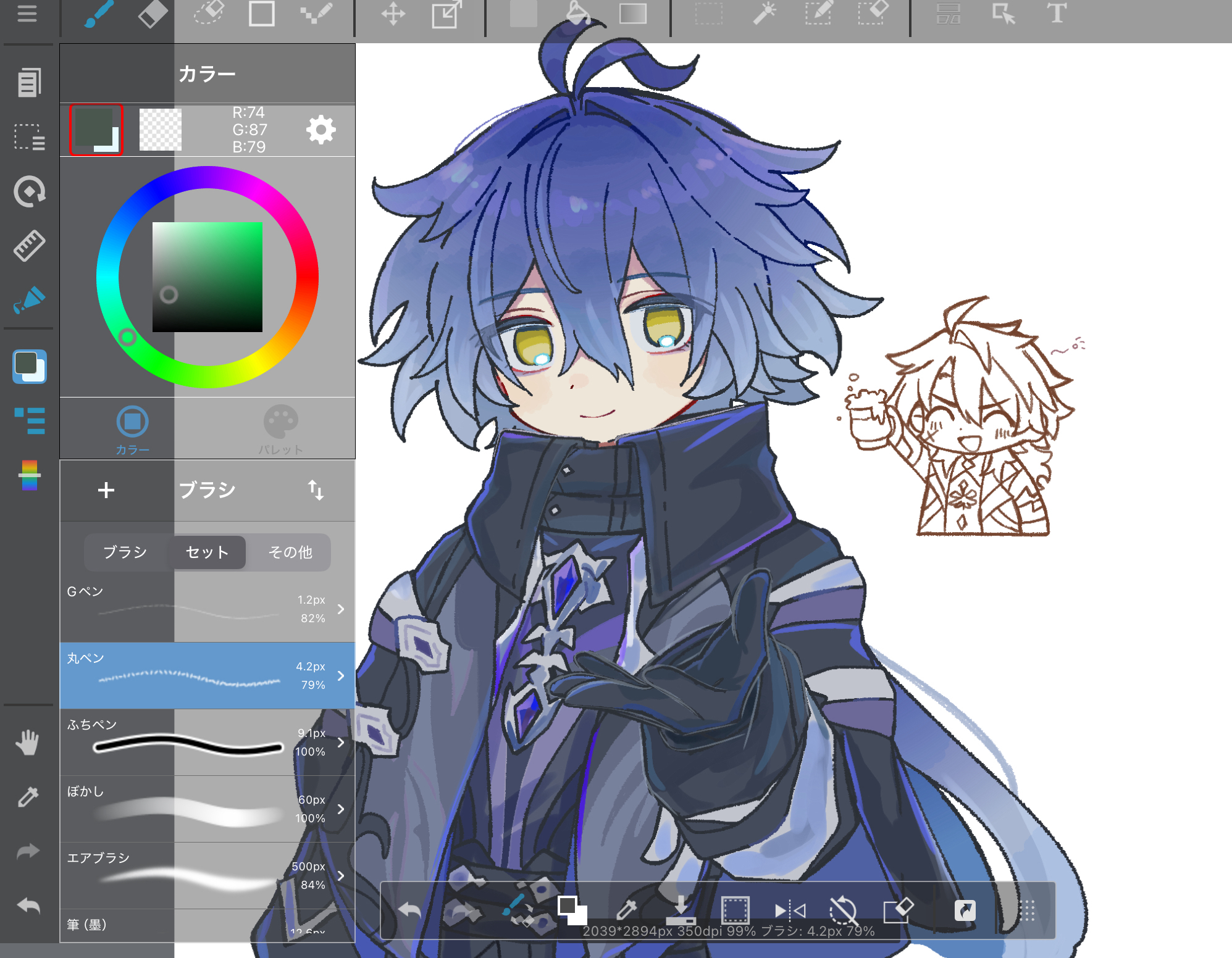 2boys ahoge art_program_in_frame beer_mug black_gloves black_shirt blue_hair chibi chibi_inset commentary_request cup empty_eyes flins_(genshin_impact) genshin_impact gloves grey_jacket hand_up hara_(nanohara) highres holding holding_cup jacket looking_at_viewer male_focus mug multiple_boys painttool_sai reaching reaching_towards_viewer shirt smile upper_body varka_(genshin_impact) yellow_eyes