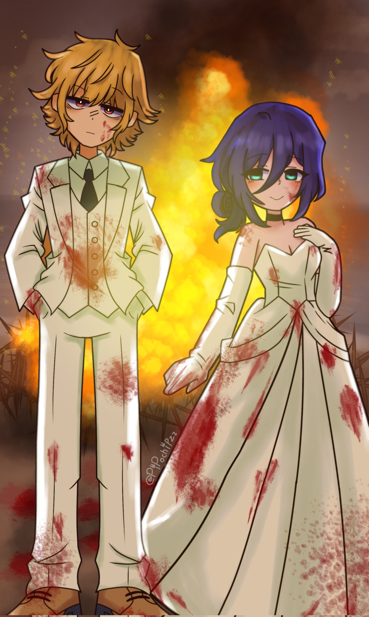 1boy 1girl bare_shoulders black_choker black_necktie blonde_hair blood blood_on_clothes blood_on_face blue_eyes blue_hair breasts brown_shoes buttons chainsaw_man choker cleavage closed_mouth corrupted_twitter_file denji_(chainsaw_man) dress elbow_gloves explosion expressionless formal_clothes gloves hand_on_own_chest looking_at_viewer medium_breasts medium_hair necktie outdoors pants pipo_(pipochipzz) red_eyes reze_(chainsaw_man) shirt shoes short_hair smile suit twitter_username white_dress white_gloves white_pants white_shirt white_suit