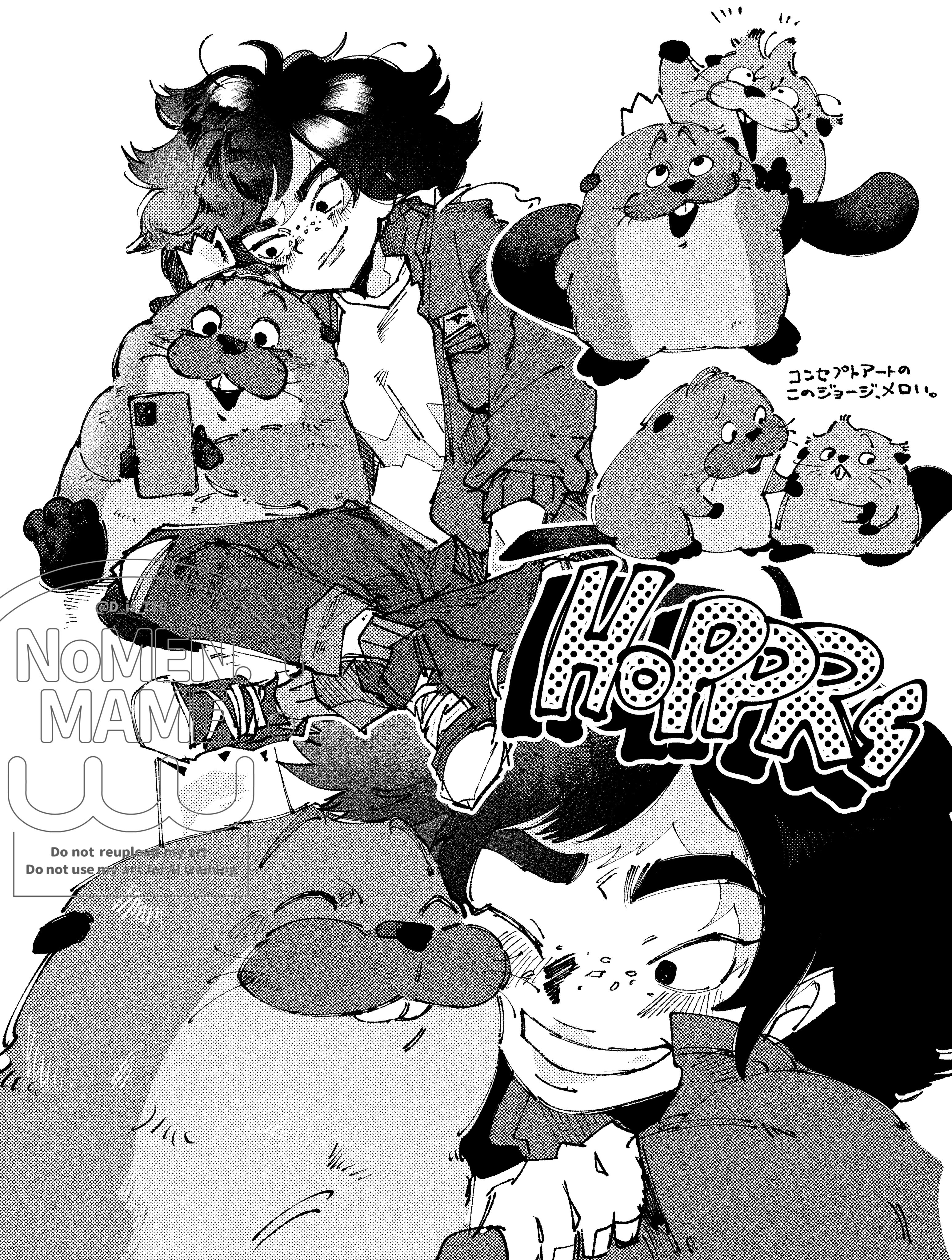 1boy 1girl :3 alternate_form animal artist_request beaver blush disney green_jacket holding holding_animal holding_phone hoppers hug jacket king_george_(hoppers) looking_at_viewer mabel_tanaka messy_hair monochrome parted_lips phone pixar