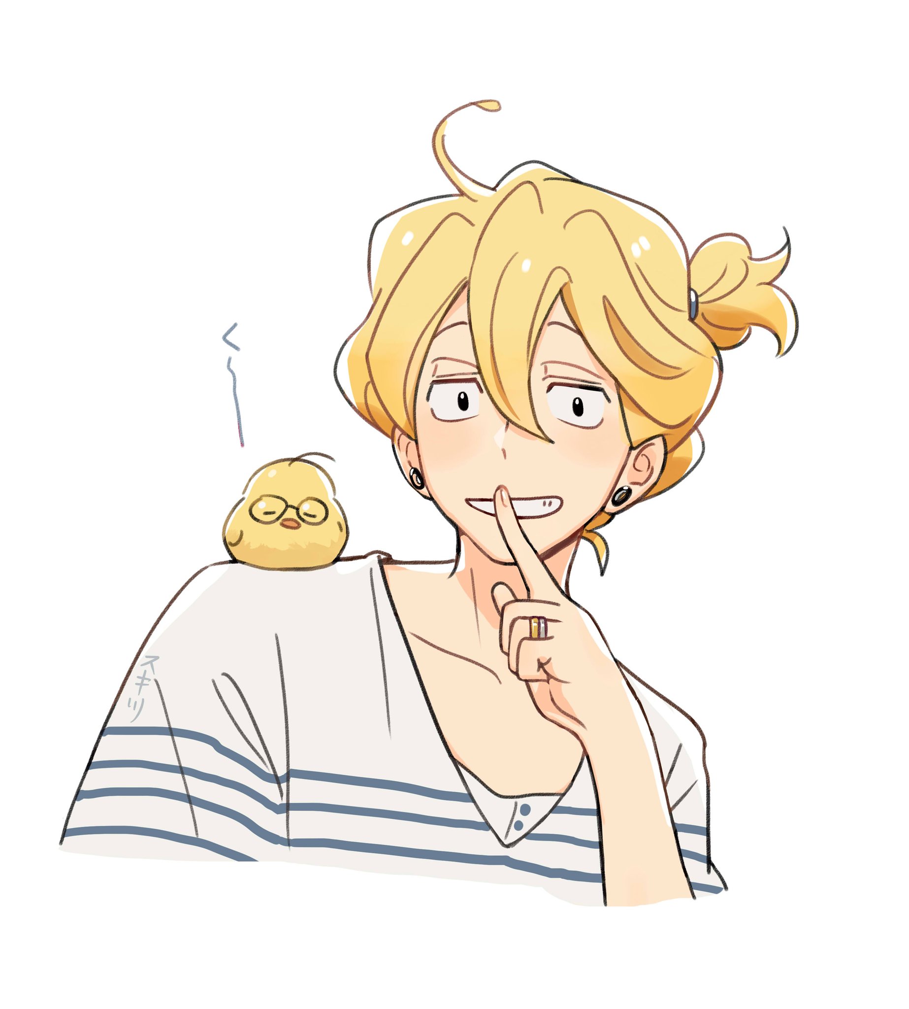 1boy ahoge animal animal_on_shoulder animalization blonde_hair butter_skittles commentary doukyuusei_(manga) earrings finger_to_mouth hair_between_eyes highres jewelry kusakabe_hikaru male_focus ponytail ring sajou_rihito shirt short_hair shushing simple_background sleeping untranslatable_commentary white_background