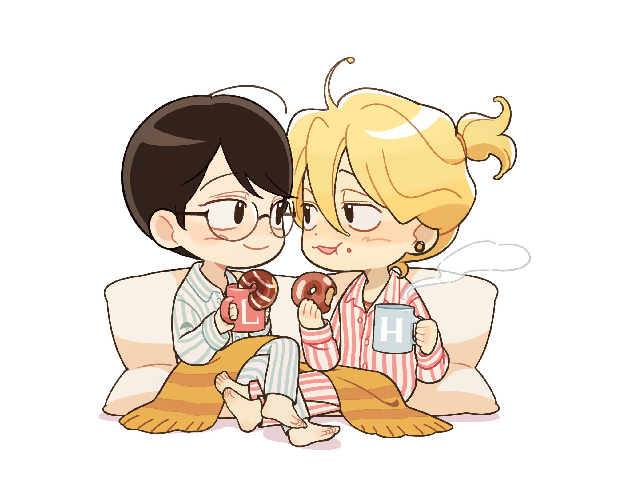 2boys ahoge blonde_hair blue_pajamas blush brown_eyes brown_hair butter_skittles chibi chibi_inset commentary cup donut doukyuusei_(manga) earrings eating food glasses highres holding holding_cup jewelry kusakabe_hikaru male_focus multiple_boys pajamas ponytail red_pajamas round_eyewear sajou_rihito semi-rimless_eyewear short_hair simple_background sitting smile striped_clothes striped_pajamas under-rim_eyewear untranslatable_commentary vertical-striped_clothes vertical-striped_pajamas white_background yaoi