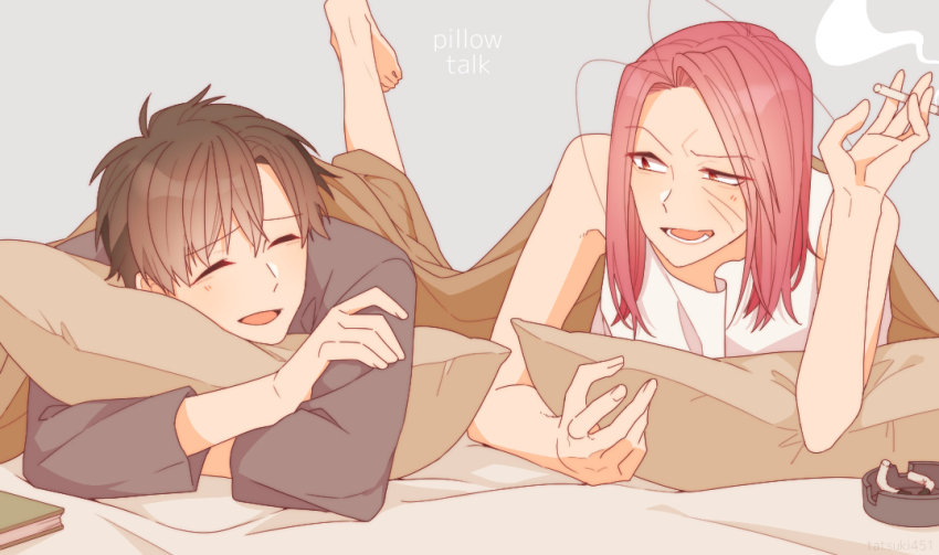 2boys antenna_hair brown_hair cho_hakkai cigarette closed_eyes hiroki_(redcco) holding holding_cigarette hugging_object leg_up looking_at_another lying male_focus multiple_boys on_stomach open_mouth pillow pillow_hug red_hair saiyuki sha_gojyo short_hair smile teeth