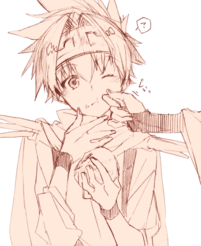 2boys ? armor bridal_gauntlets circlet food food_on_face genjou_sanzou hiroki_(redcco) holding holding_food male_focus monochrome multiple_boys one_eye_closed out_of_frame saiyuki short_hair shoulder_armor solo_focus son_goku_(saiyuki) white_background wristband