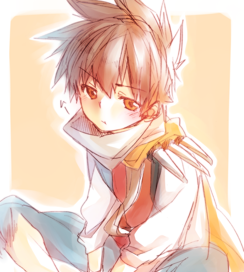 1boy armor border brown_hair feet_out_of_frame hiroki_(redcco) male_focus outside_border saiyuki scarf shirt short_hair shoulder_armor sitting solo son_goku_(saiyuki) white_border