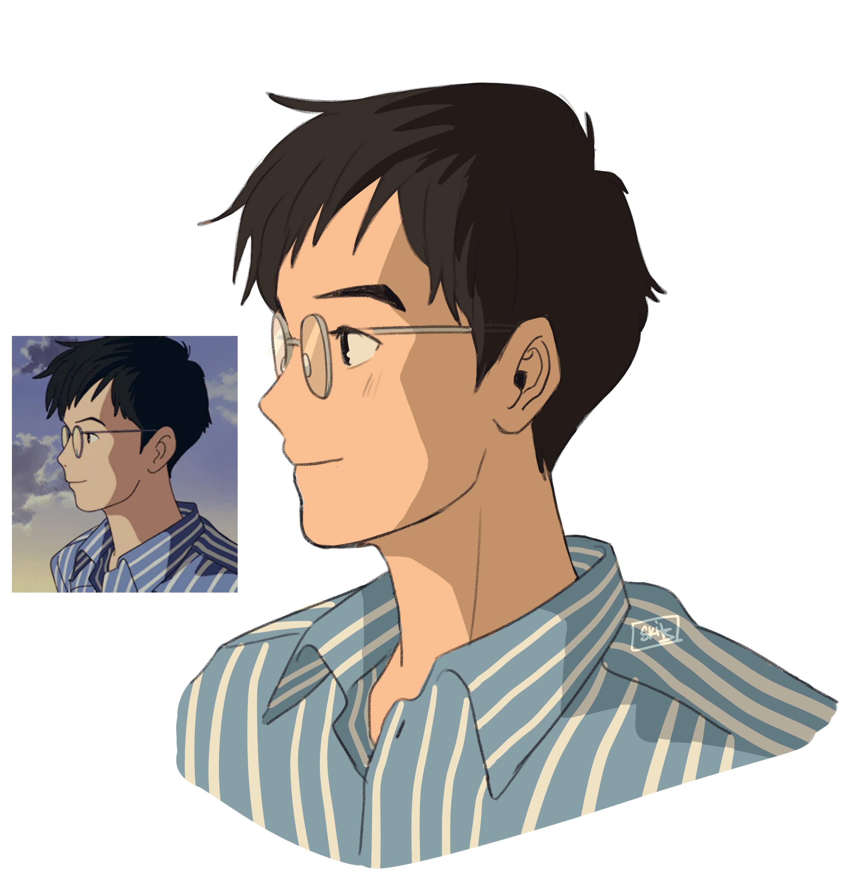 1boy absurdres anime_screenshot_inset black_hair blush butter_skittles closed_mouth commentary cropped_shoulders glasses highres male_focus matsuno_yutaka reference_inset round_eyewear screenshot_inset shirt short_hair sideburns simple_background solo striped_clothes striped_shirt umi_ga_kikoeru vertical-striped_clothes vertical-striped_shirt white_background
