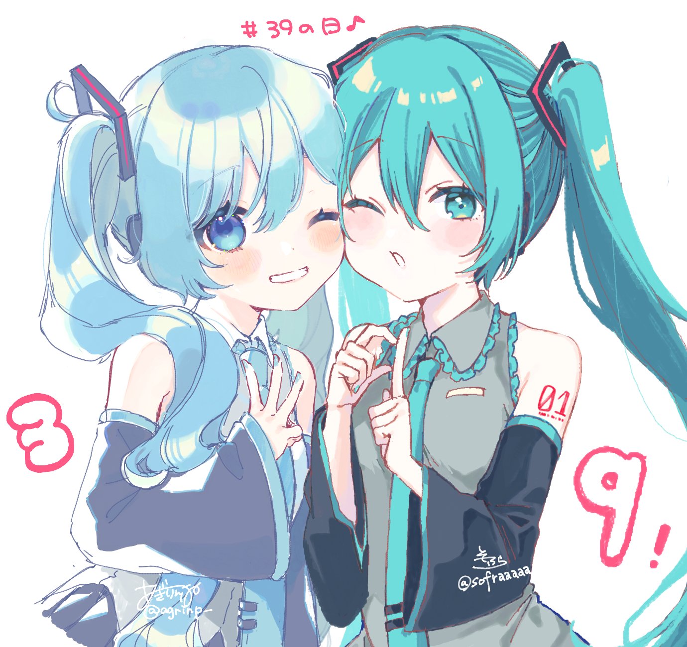 2girls 39 artist_collaboration bare_shoulders black_sleeves blue_eyes blue_hair blue_nails blue_necktie blush collared_shirt commentary detached_sleeves dual_persona grey_shirt grin hair_between_eyes hatsune_miku highres long_hair long_sleeves miku_day multiple_girls nail_polish necktie one_eye_closed rinndouk shirt signature simple_background sleeveless sleeveless_shirt smile sofra tie_clip twintails twitter_username very_long_hair vocaloid w white_background wide_sleeves