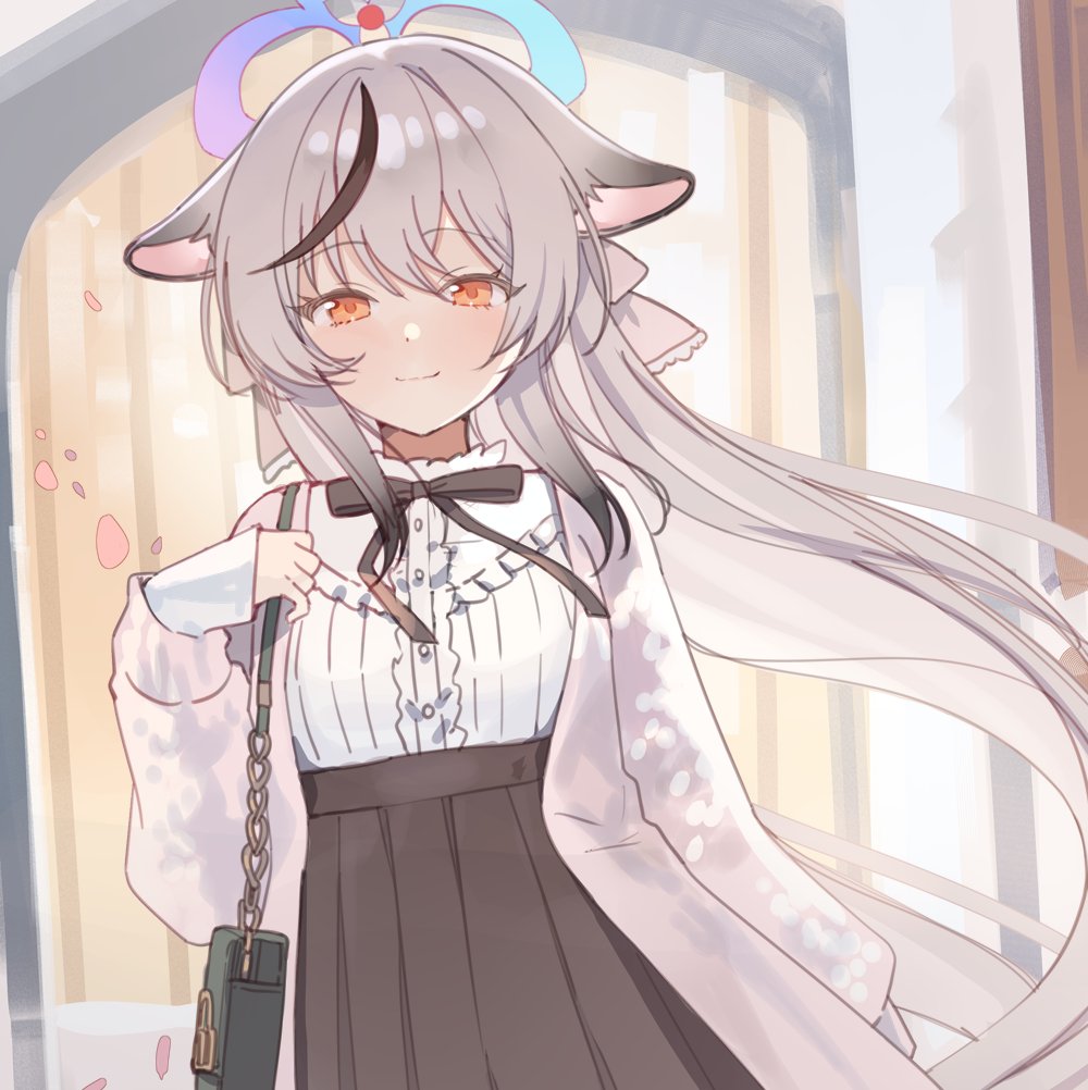 1girl alternate_costume animal_ears bag black_hair black_ribbon black_skirt blue_archive blue_halo closed_mouth coat daredattakke frills grey_hair hair_between_eyes halo handbag jacket kokona_(blue_archive) long_hair long_sleeves looking_at_viewer multicolored_hair neck_ribbon open_clothes orange_eyes petals pleated_skirt ribbon shirt shoulder_bag skirt smile solo streaked_hair tiger_ears tiger_girl very_long_hair white_shirt