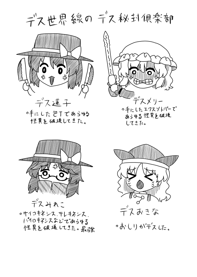 >_< 4girls anger_vein angry black_hat bow check_translation commentary covered_mouth glasses hat hat_bow holding holding_knife holding_weapon knife long_hair long_sleeves maribel_hearn matara_okina medium_hair mob_cap monochrome multiple_girls open_mouth teardrop teeth touhou translation_request usami_renko usami_sumireko weapon white_background white_bow white_hat zetsumame