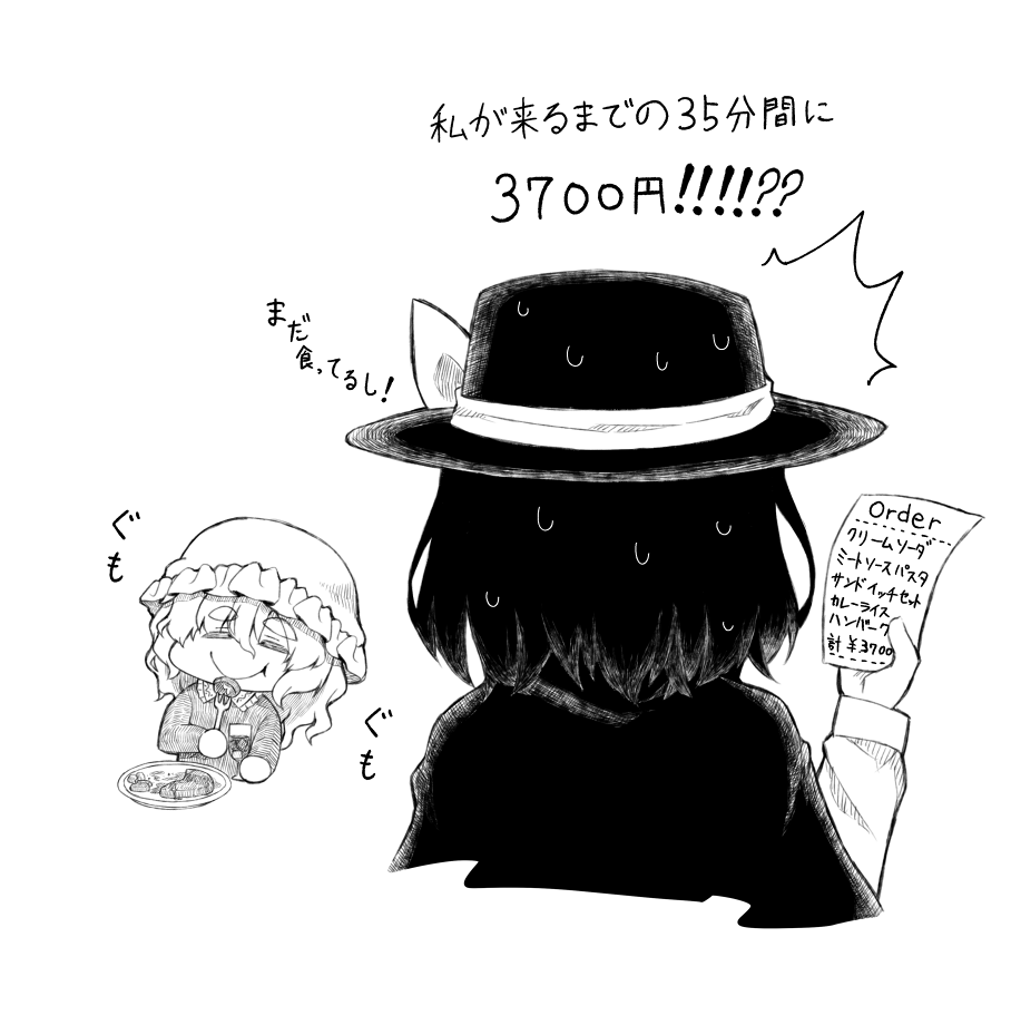 2girls black_capelet black_hat bow capelet closed_eyes closed_mouth collared_dress comedic_sweatdrop commentary contrast_collar dress drink eating food fork frilled_shirt_collar frills from_behind hat hat_bow holding holding_bill holding_drink holding_fork holding_paper long_hair maribel_hearn medium_hair mob_cap multiple_girls paper plate shirt smile touhou translated usami_renko white_bow white_hat white_shirt zetsumame
