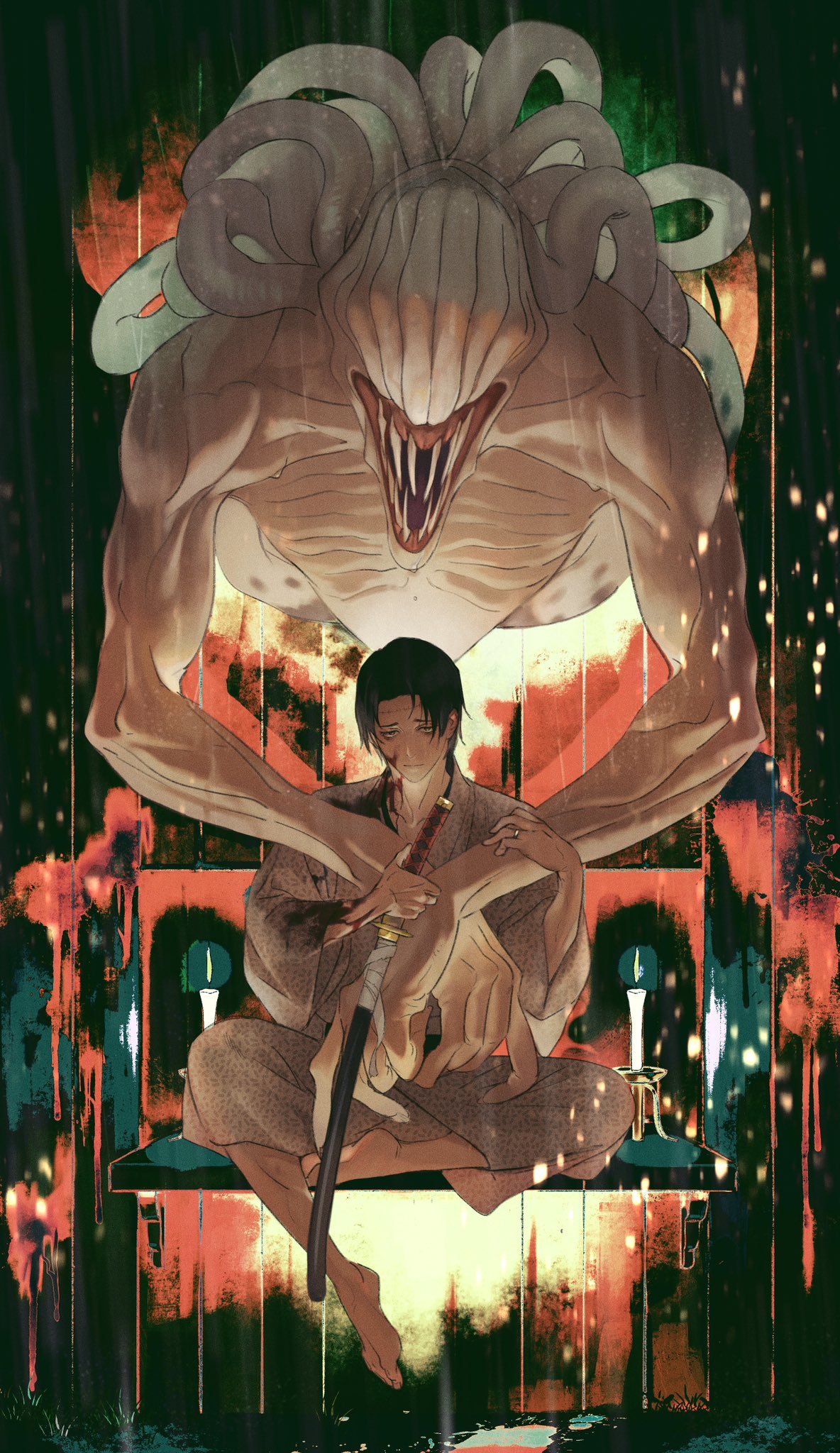 1boy barefoot black_hair blood blood_on_face full_body highres holding holding_sword holding_weapon japanese_clothes jewelry jujutsu_kaisen kimono naspibon_ox okkotsu_yuta orimoto_rika rain ring sheath sheathed short_hair sitting stitched_forehead sword toes weapon wedding_ring