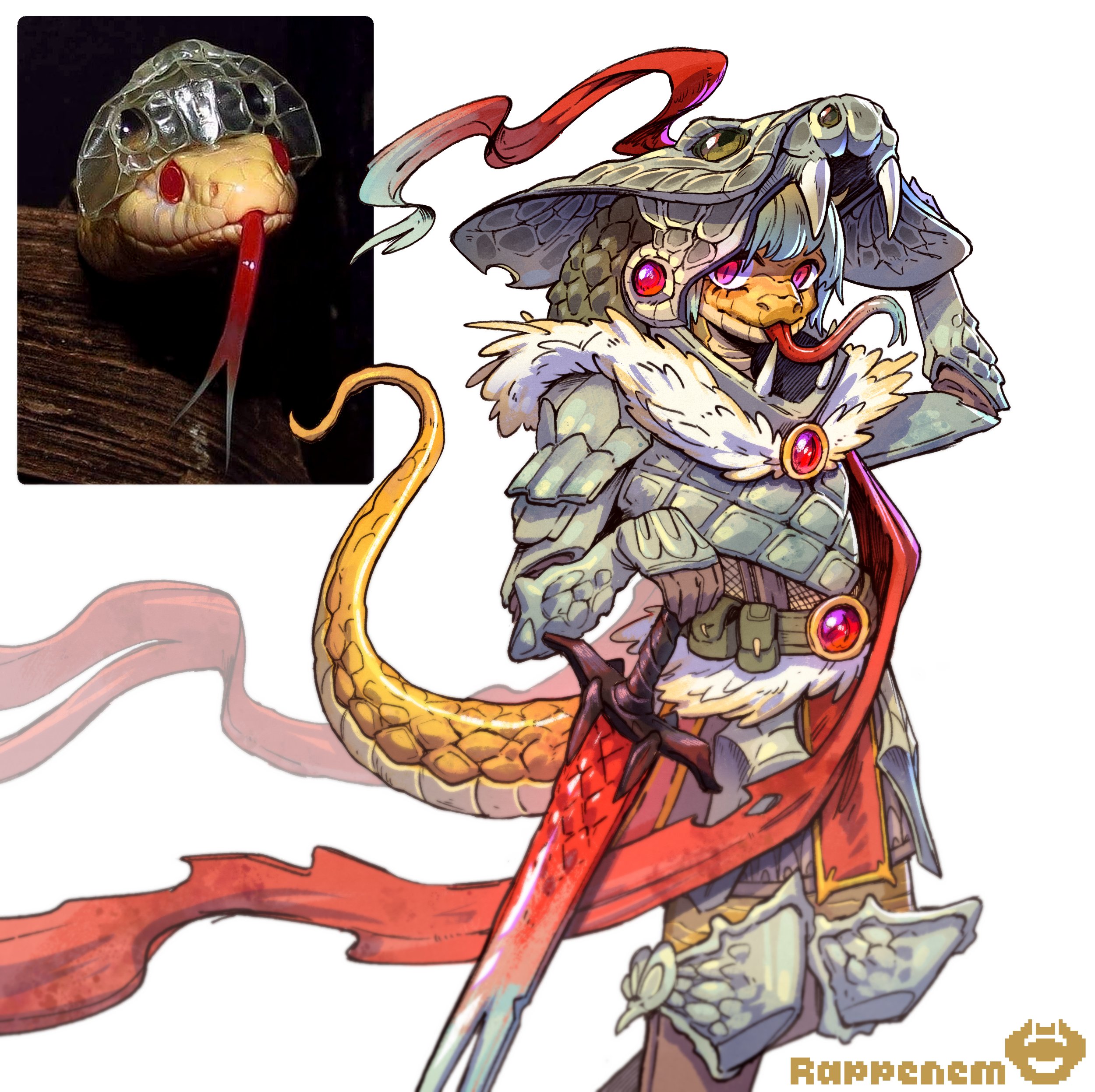 absurdres armor breastplate fang forked_tongue helmet highres knee_pads original pauldrons photo_inset rappenem red_eyes reference_inset shoulder_armor snake snake_boy snake_tail sword tail tongue weapon white_background yellow_scales