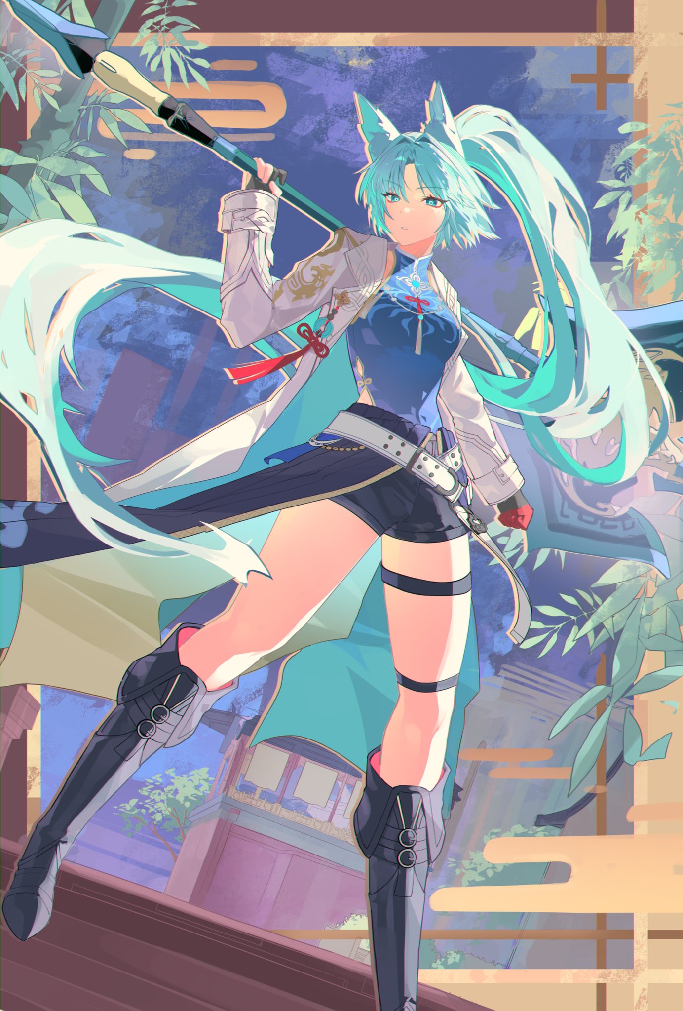 1girl animal_ears axe belt black_boots blue_eyes blue_shirt boots breasts chyucat feixiao_(honkai:_star_rail) fox_ears fox_girl highres holding holding_axe honkai:_star_rail honkai_(series) large_breasts long_hair ponytail shirt solo thigh_strap very_long_hair white_hair