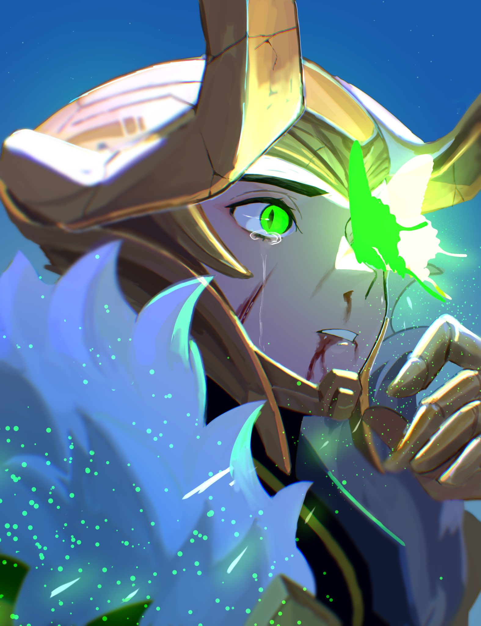 1boy animification blood blood_on_face blue_background bug butterfly butterfly_on_nose cape cracked_helmet fake_horns fur-trimmed_cape fur_trim gold_gauntlets gold_helmet green_butterfly green_eyes helmet highres horned_helmet horns implied_after_fight insect loki_(marvel) looking_at_animal male_focus marvel marvel_rivals nanimodekiyasne one_eye_covered parted_lips solo_focus tears thor_(marvel)_(series) upper_body