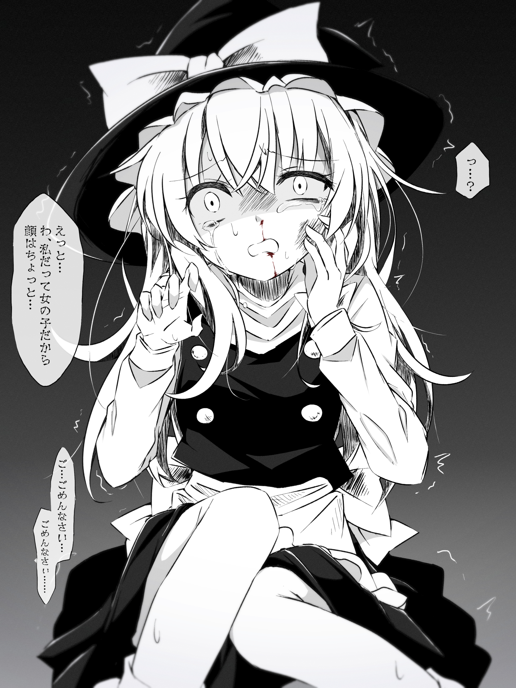 1girl abuse apron back_bow blood bow commentary_request crying crying_with_eyes_open hat hat_bow highres kirisame_marisa long_hair long_sleeves looking_at_viewer nosebleed open_mouth ryona scared skirt slap_mark slap_mark_on_face solo speech_bubble spot_color tears touhou translation_request trembling tsuukinkaisoku_oomiya vest waist_apron witch_hat