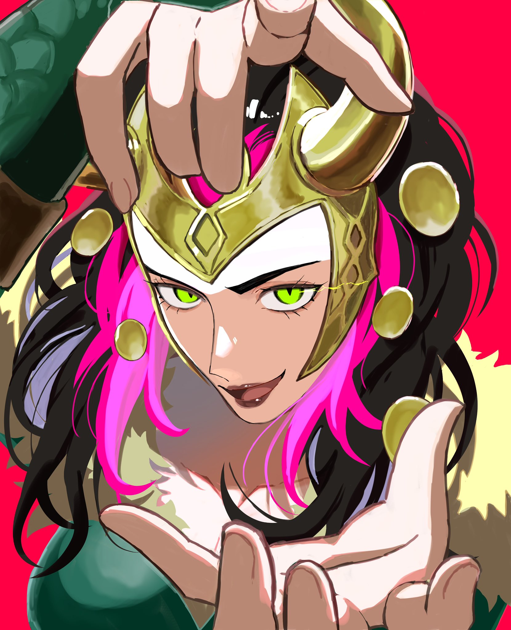 1girl alternate_form animification black_hair bridal_gauntlets commentary_request eye_trail fake_horns fur-trimmed_shirt fur_trim green_bridal_gauntlets green_eyes green_shirt highres horned_headwear horns lady_loki light_trail loki_(marvel) long_hair looking_at_viewer makeup marvel multicolored_hair nanimodekiyasne open_mouth pink_hair red_background red_lips shirt solo thor_(marvel)_(series) upper_body