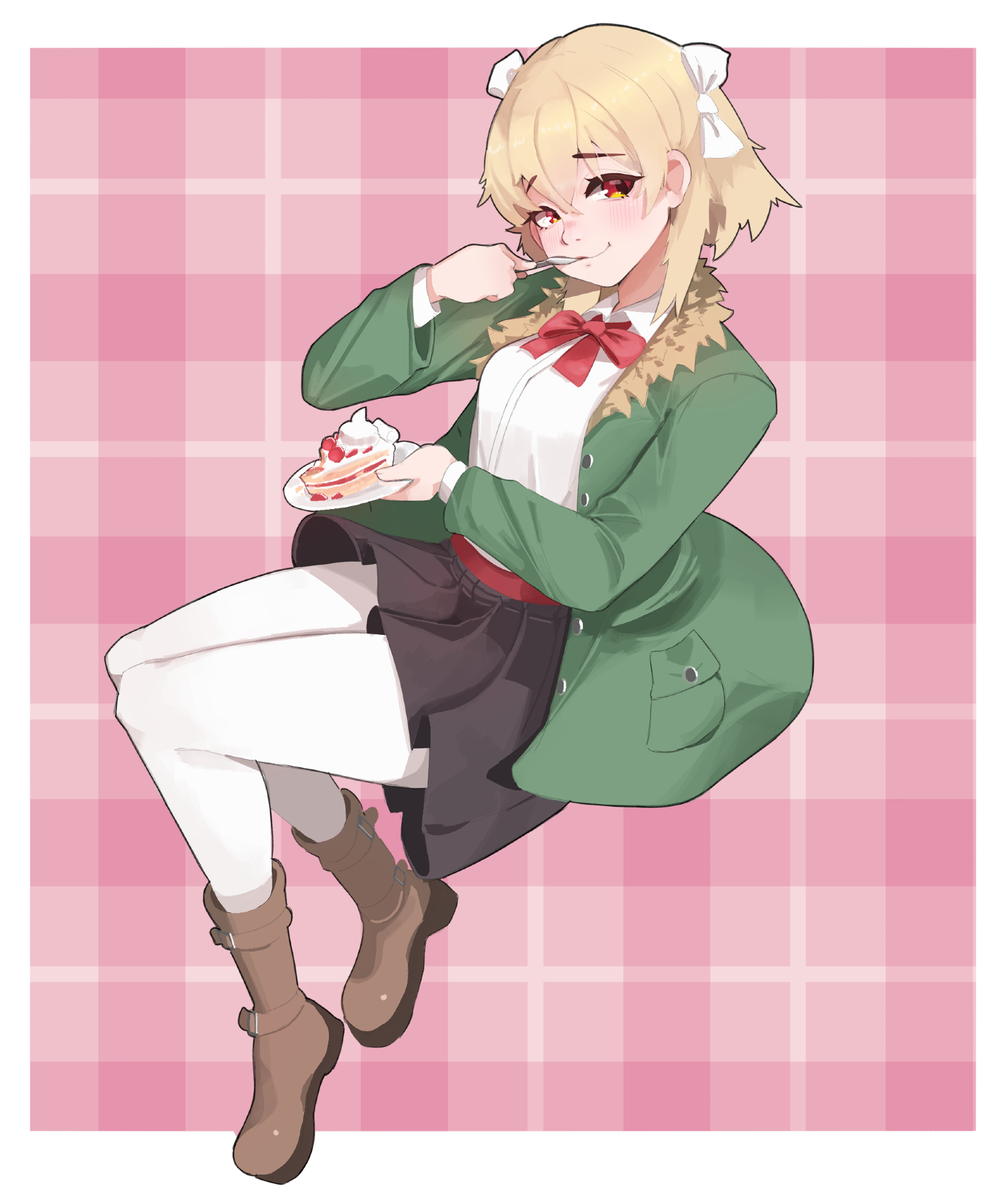 1girl belt black_skirt blonde_hair boots borrowed_character bow bowtie breasts brown_boots cake closed_mouth commentary crossed_bangs double-parted_bangs eating english_commentary female_focus food green_jacket hair_between_eyes hair_bow highres holding holding_plate holding_utensil jacket leggings long_sleeves looking_at_viewer maishtar_colo medium_hair original pink_background plaid_background plate raised_inner_eyebrows red_belt red_bow red_bowtie red_eyes shirt sitting skirt small_breasts smile spoon strawberry_shortcake utensil_in_mouth white_bow white_leggings white_shirt